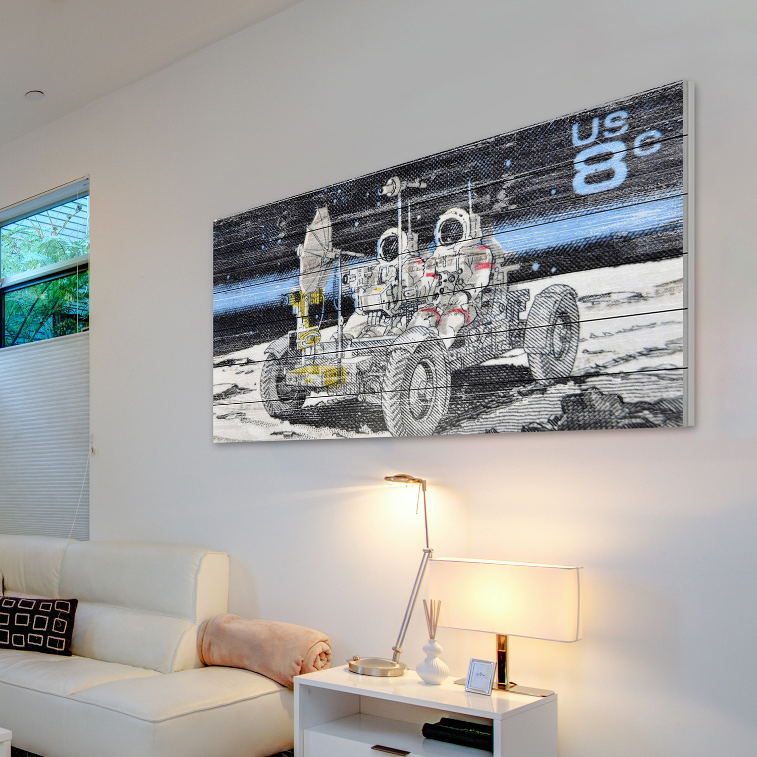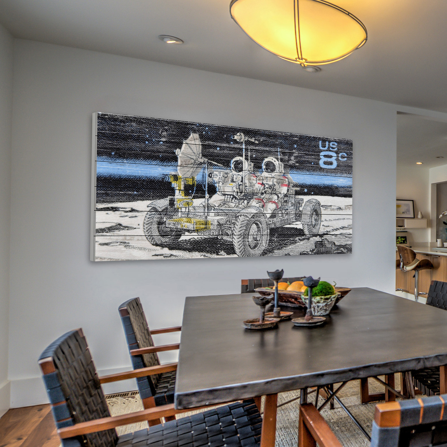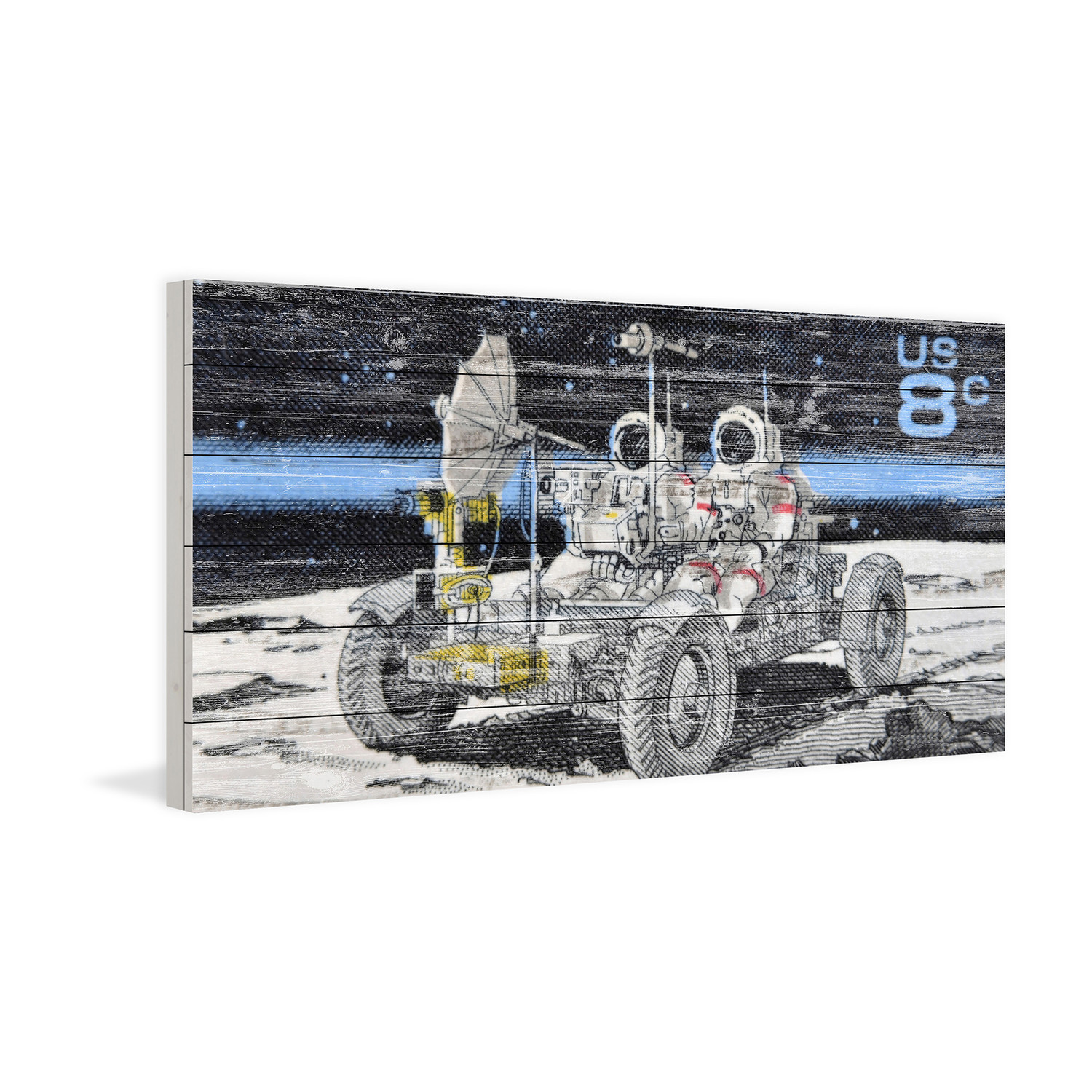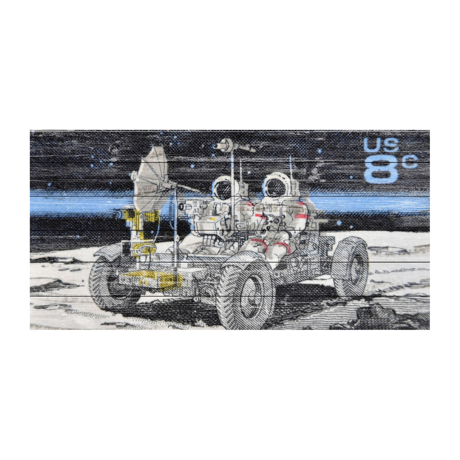 Eccentric and juxtaposed, this collection of pieces from the Marmont Hill art collective is rustic and rugged, artfully faded onto white wood planks, but features bold and futuristic imagery. Enjoy spacemen, flying saucers, and distant moons, laid over a classical Americana aesthetic.