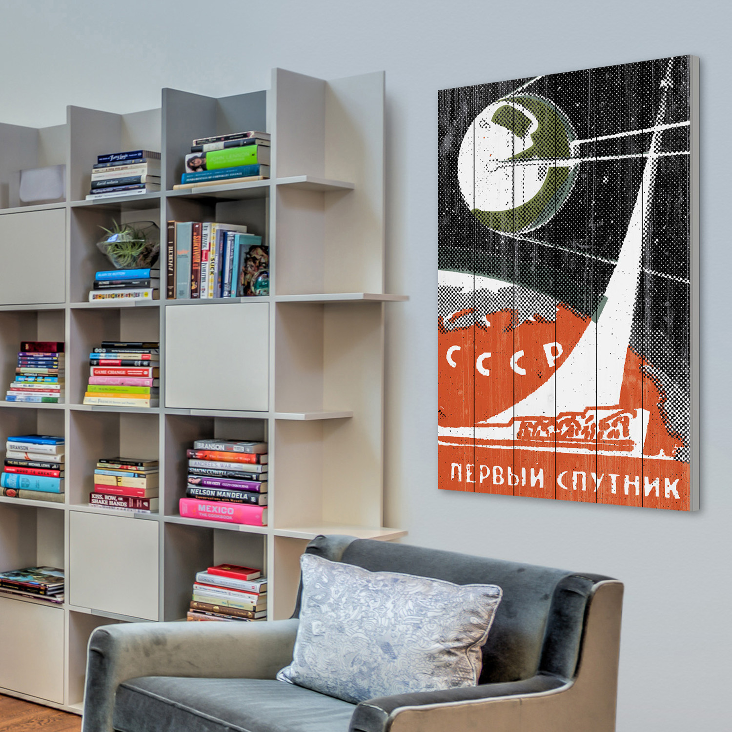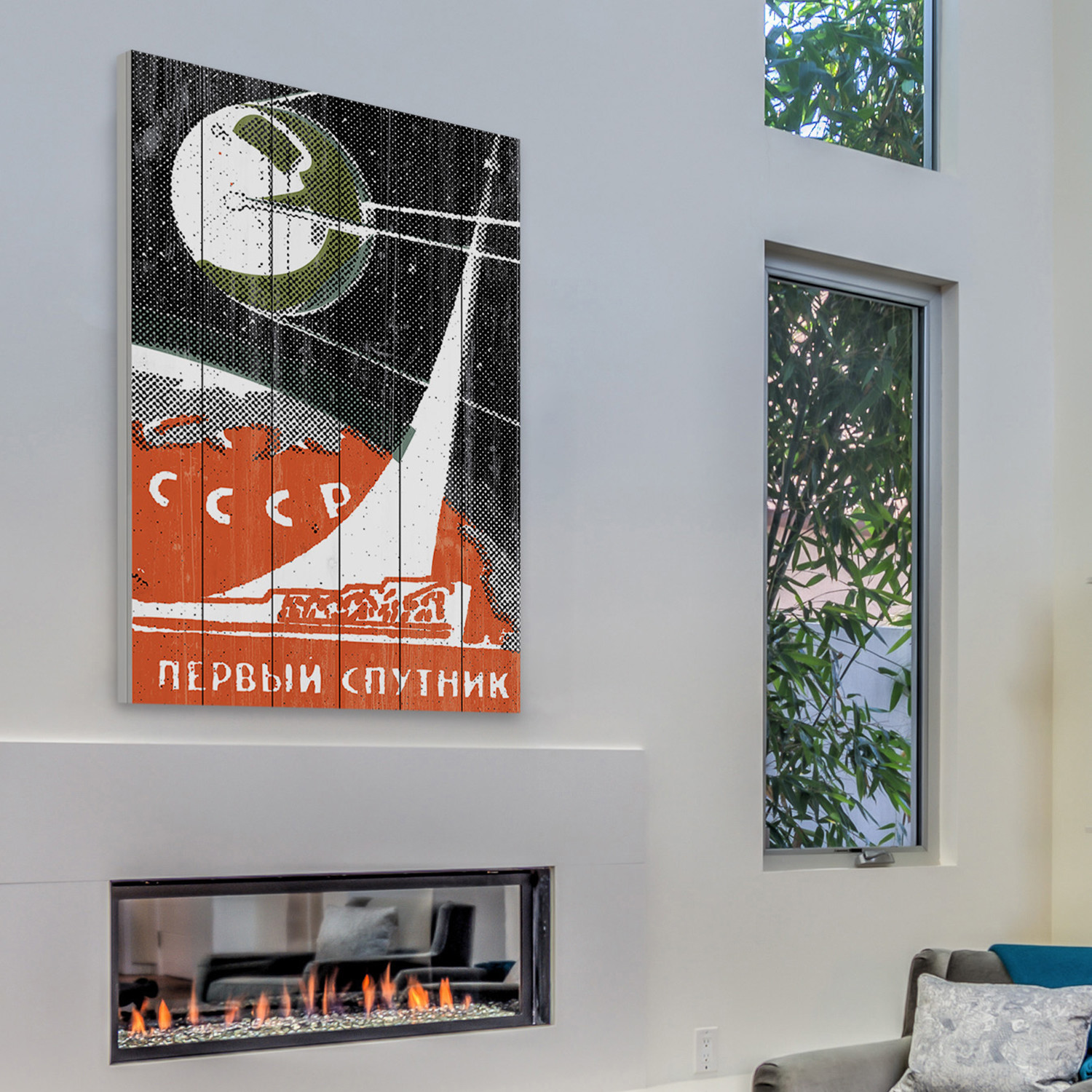 Eccentric and juxtaposed, this collection of pieces from the Marmont Hill art collective is rustic and rugged, artfully faded onto white wood planks, but features bold and futuristic imagery. Enjoy spacemen, flying saucers, and distant moons, laid over a classical Americana aesthetic.