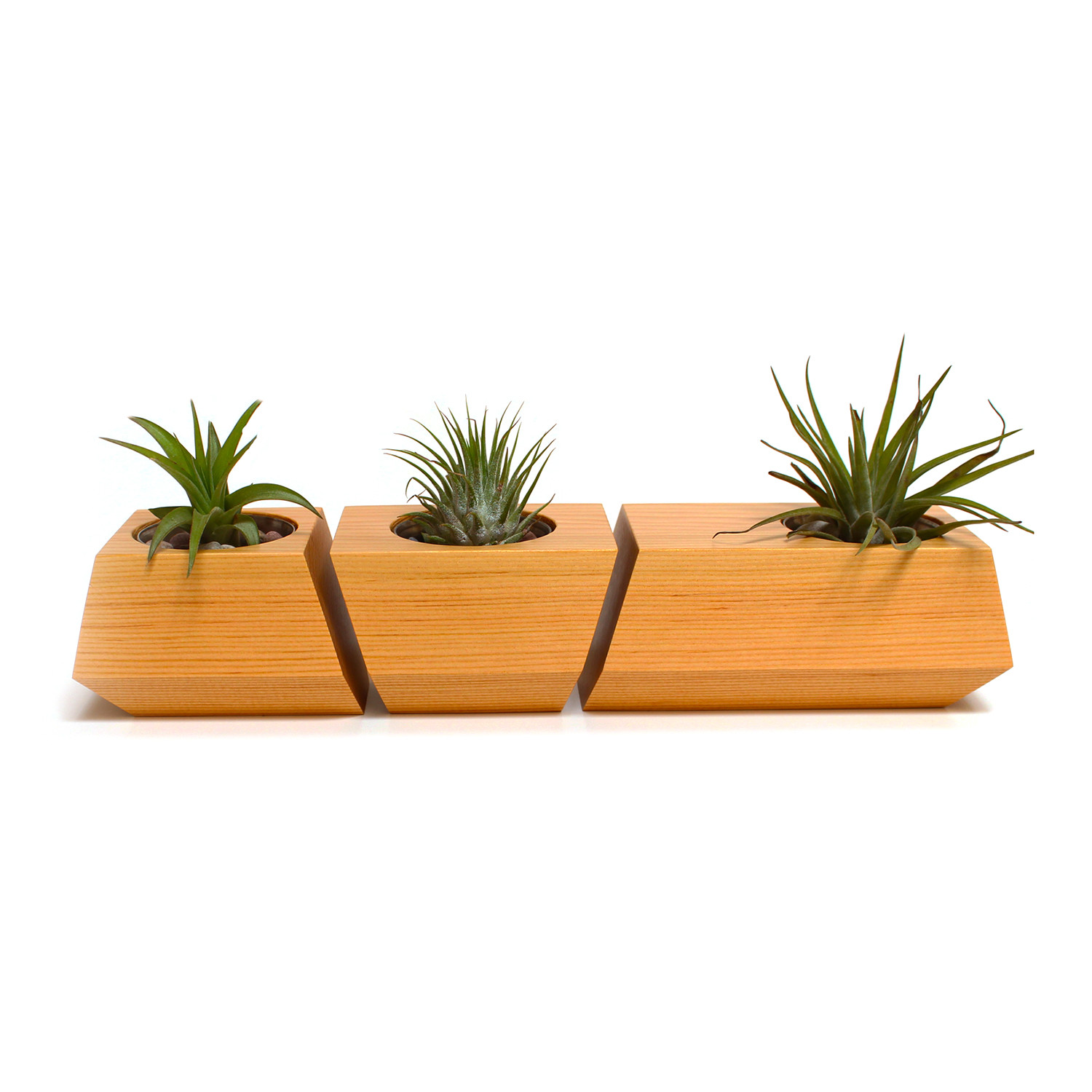 Sourced from reclaimed Douglas Fir wood, Boxcar planter set is a cleverly complementary grouping of small planters that are perfect for succulents, and look simple and elegant along a window sill, or as a centerpiece for a table or desk. With a stainless steel inset to hold the plant, it's incredibly easy to place your favorite succulents in soil, and position them within the planters. Handmade in Portland, this little wooden trio is cut from a single piece of wood, so that the grain matches up perfectly when the pieces are positioned in order.