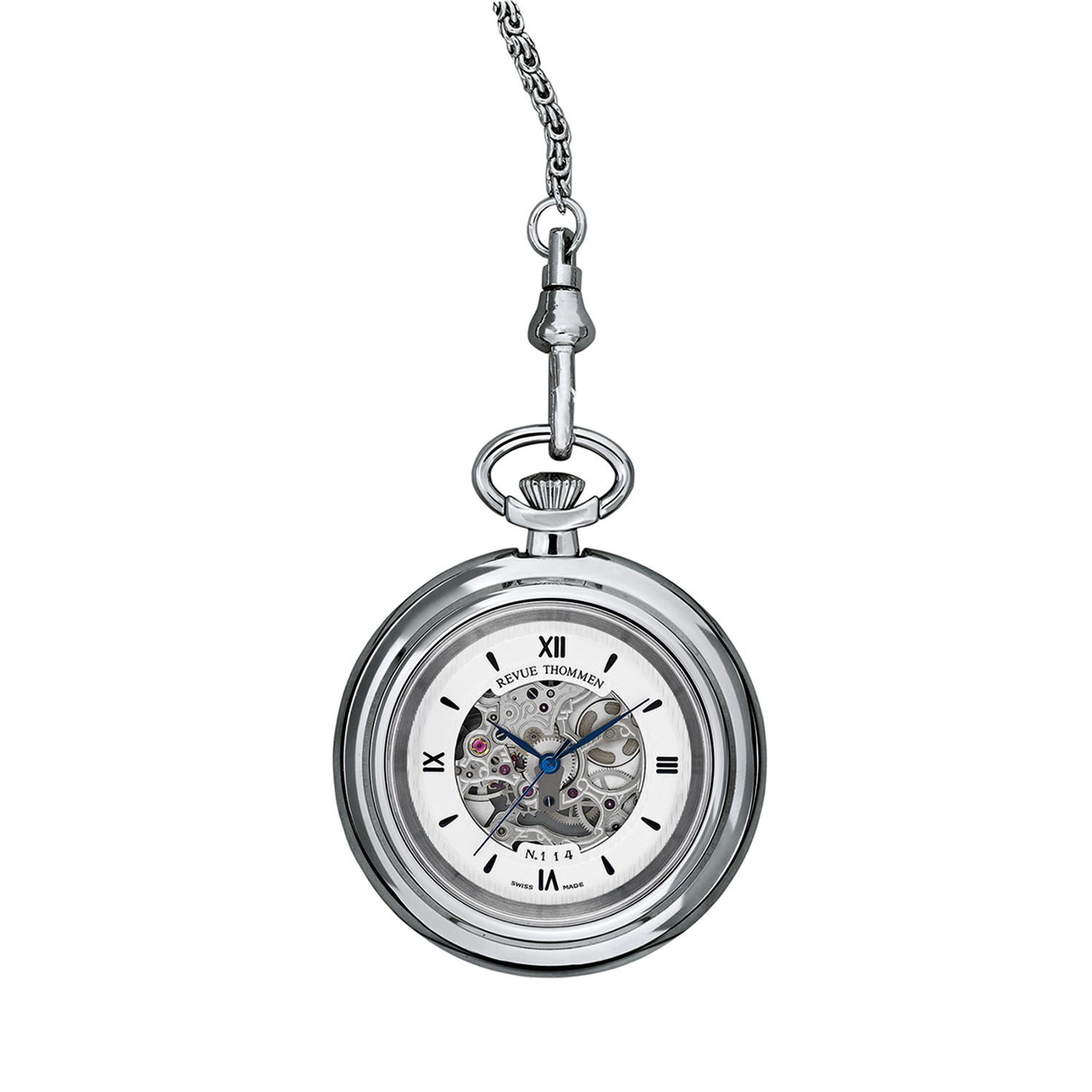 The Revue Thommen Manufacture Skeleton 80 Manual Wind Pocket Watch features a mechanical manufacture movement GT 44 under a scratchproof sapphire crystal and a see-through mineral crystal case back, with an analog display and a skeleton movement view.