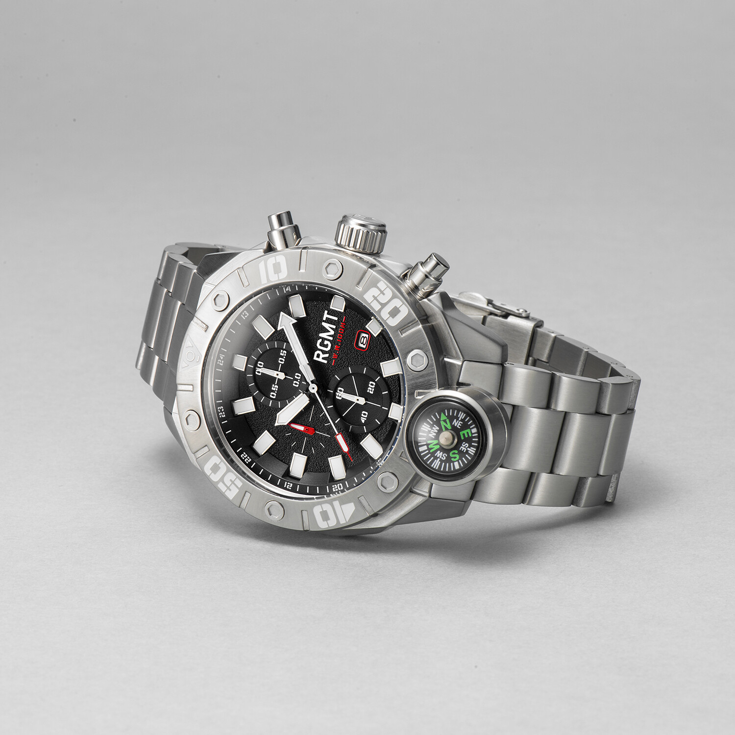 The Hannibal's astute and considered design makes it a dashboard of information right on your wrist. The swivel action of the bezel moves the onboard compass for an instantaneous readout.