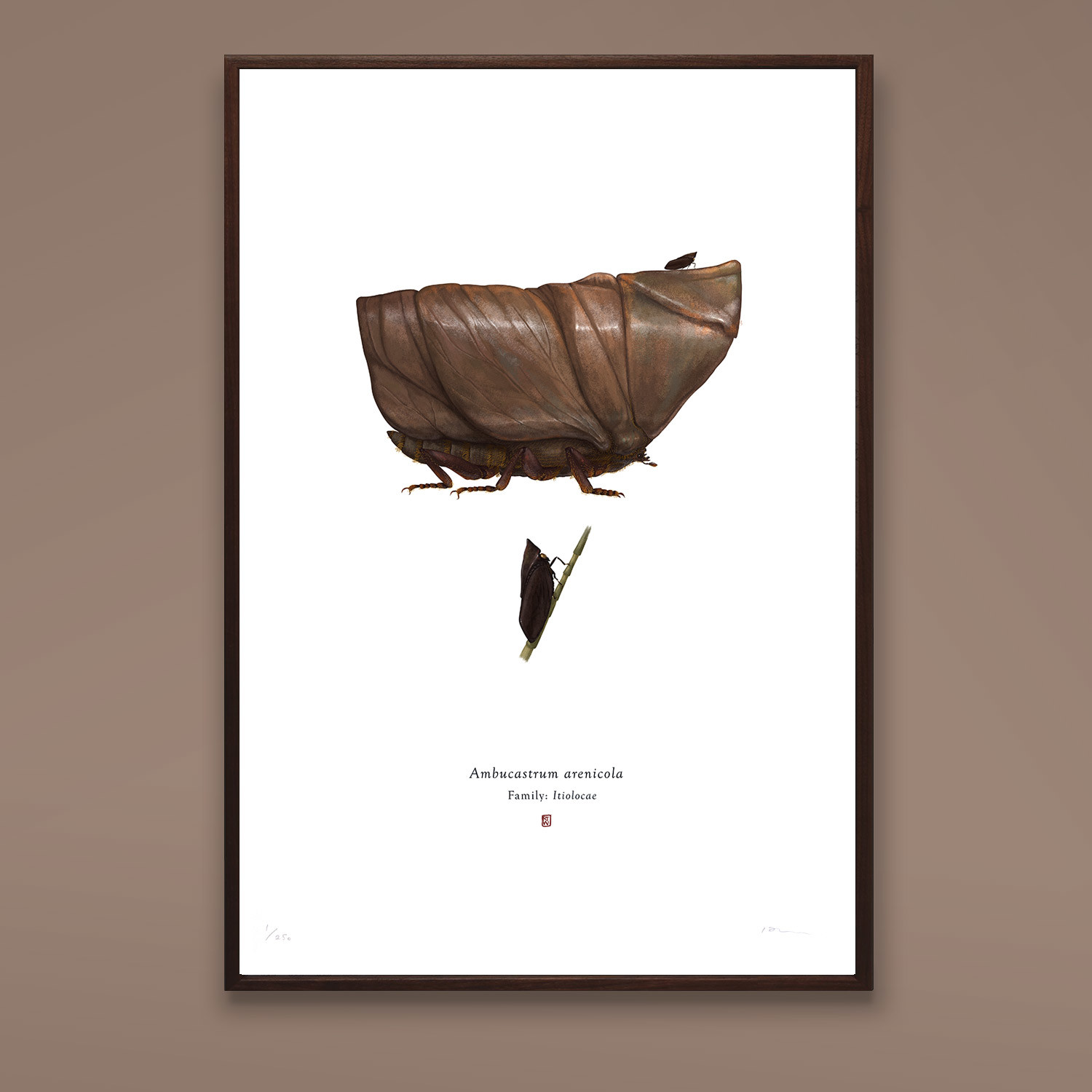 Inspired by the concept of collection and classification, artist Richard Wilkinson creates unique art pieces that fuse pop culture with natural history and scientific aesthetics. This limited edition print from the Arthropoda Iconicus Collection features an imaginary creature from his “Insects From A Far Away Galaxy” series— bringing the subtle, yet unmistakable imagery of the Star Wars universe to the world of entomology. Individually hand signed by Wilkinson himself, each is perfect for adding an understated, beautifully printed, and uniquely scientific detail to your walls.
