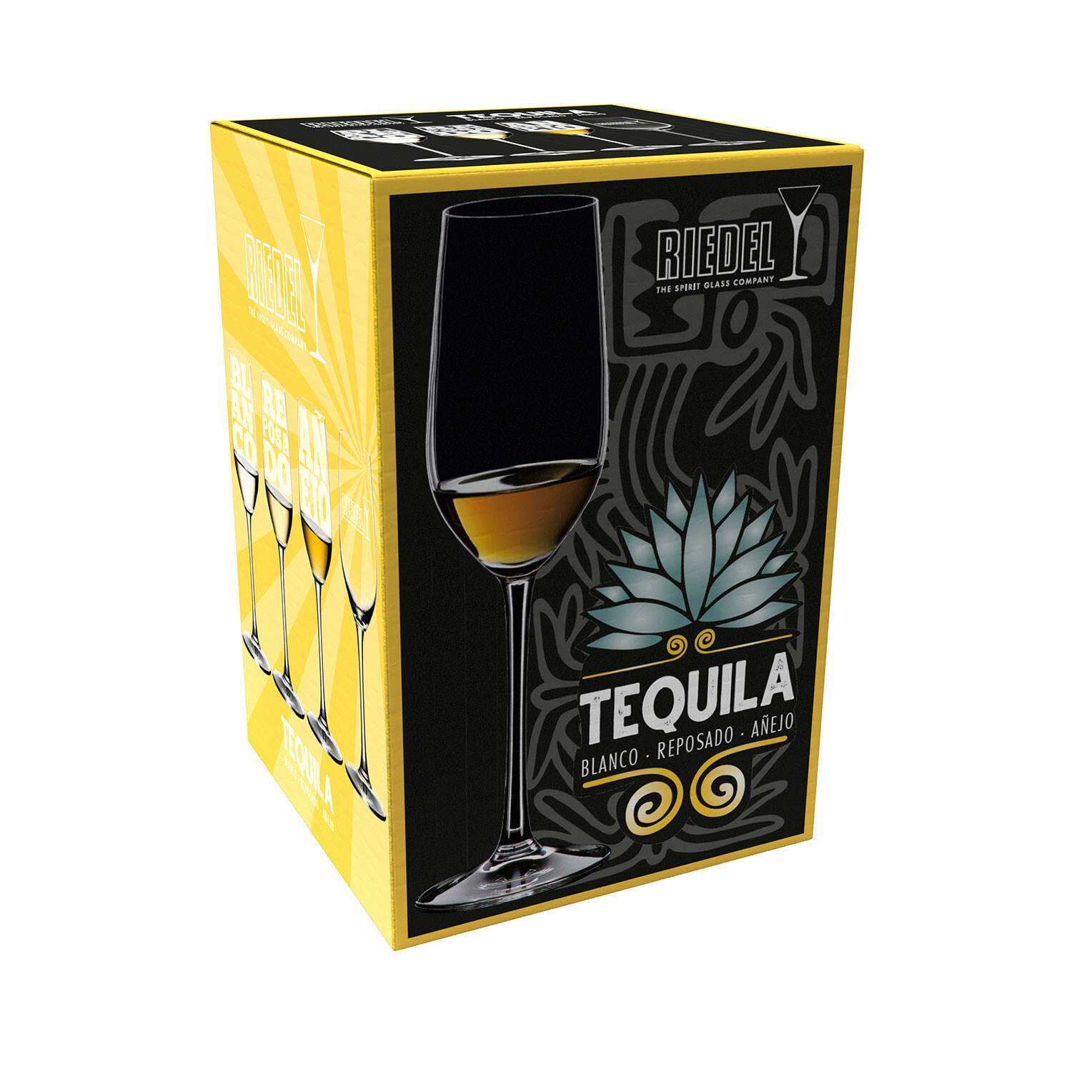 The Riedel Ouverture Tequila Glass has a tall stem, meant to lift fine Tequila to the level it deserves, to accord it the appreciation and respect of which it is worthy, and comes packed four to a black box decorated with drawings of the blue agave plant.