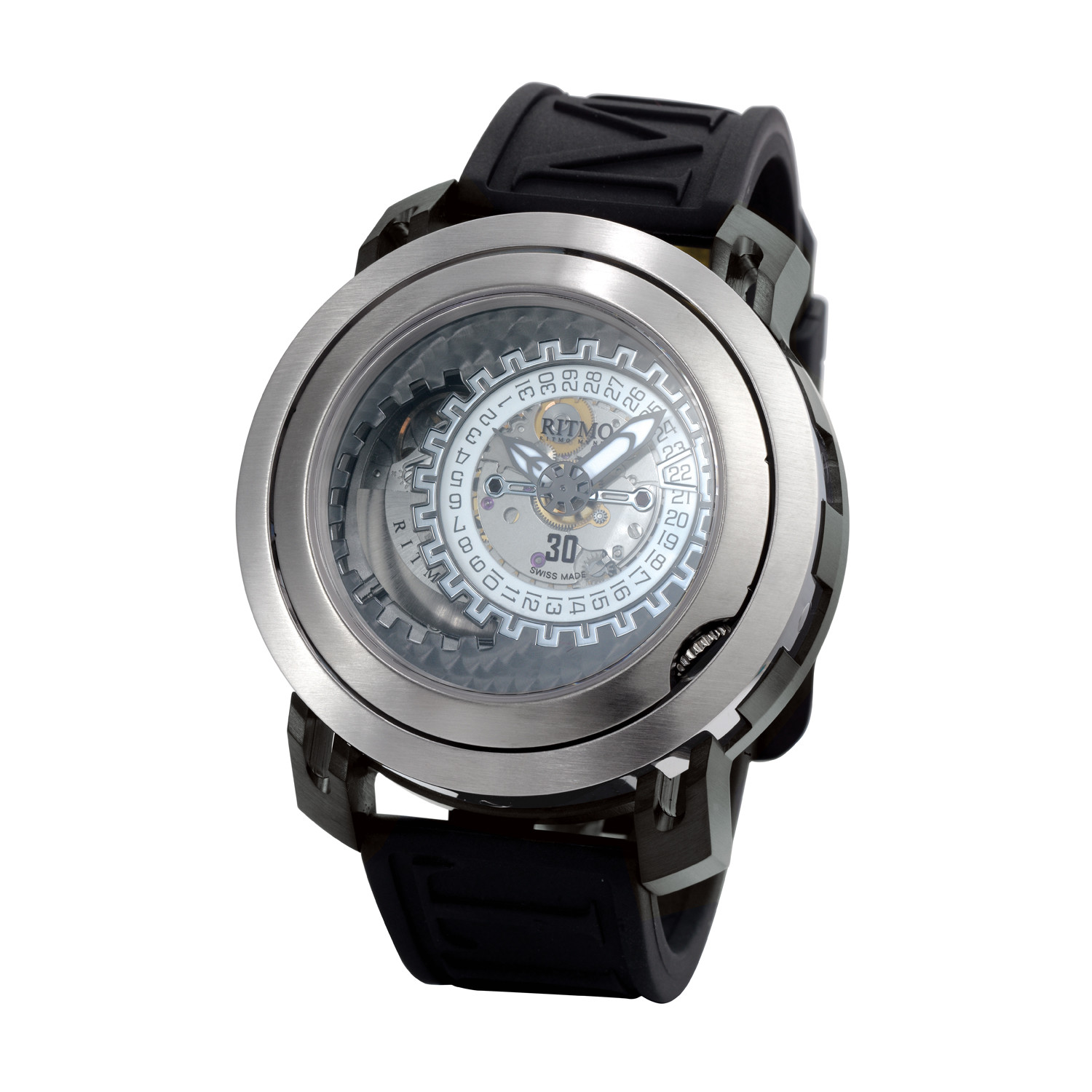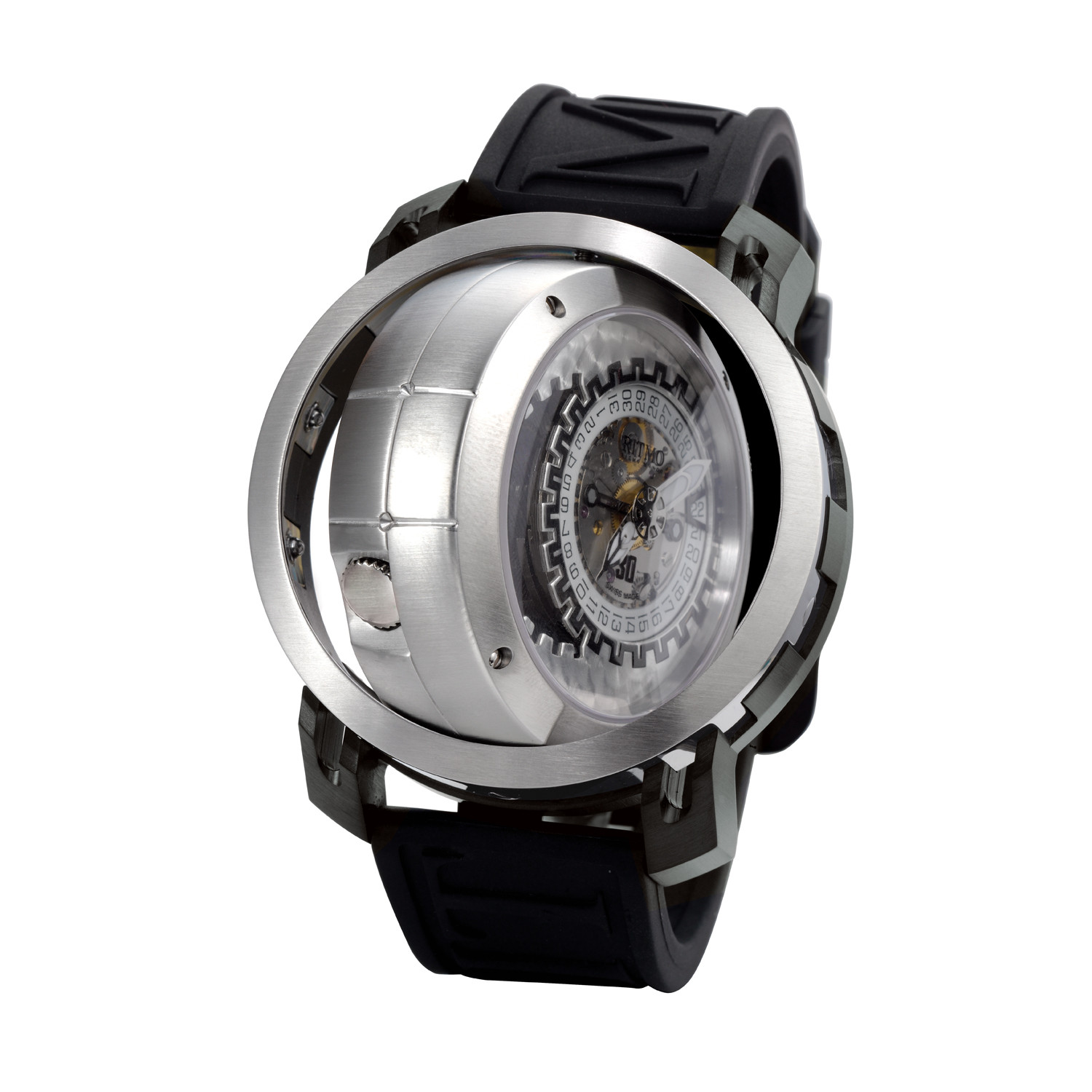 This Persepolis watch is dual time automatic with a stainless steel and black IP case. The dual exhibition dial has an exposed date wheel; the face also has sapphire crystal and a signature black silicone strap. This watch is water resistant to 5 ATM so you can splash and shower with it on.