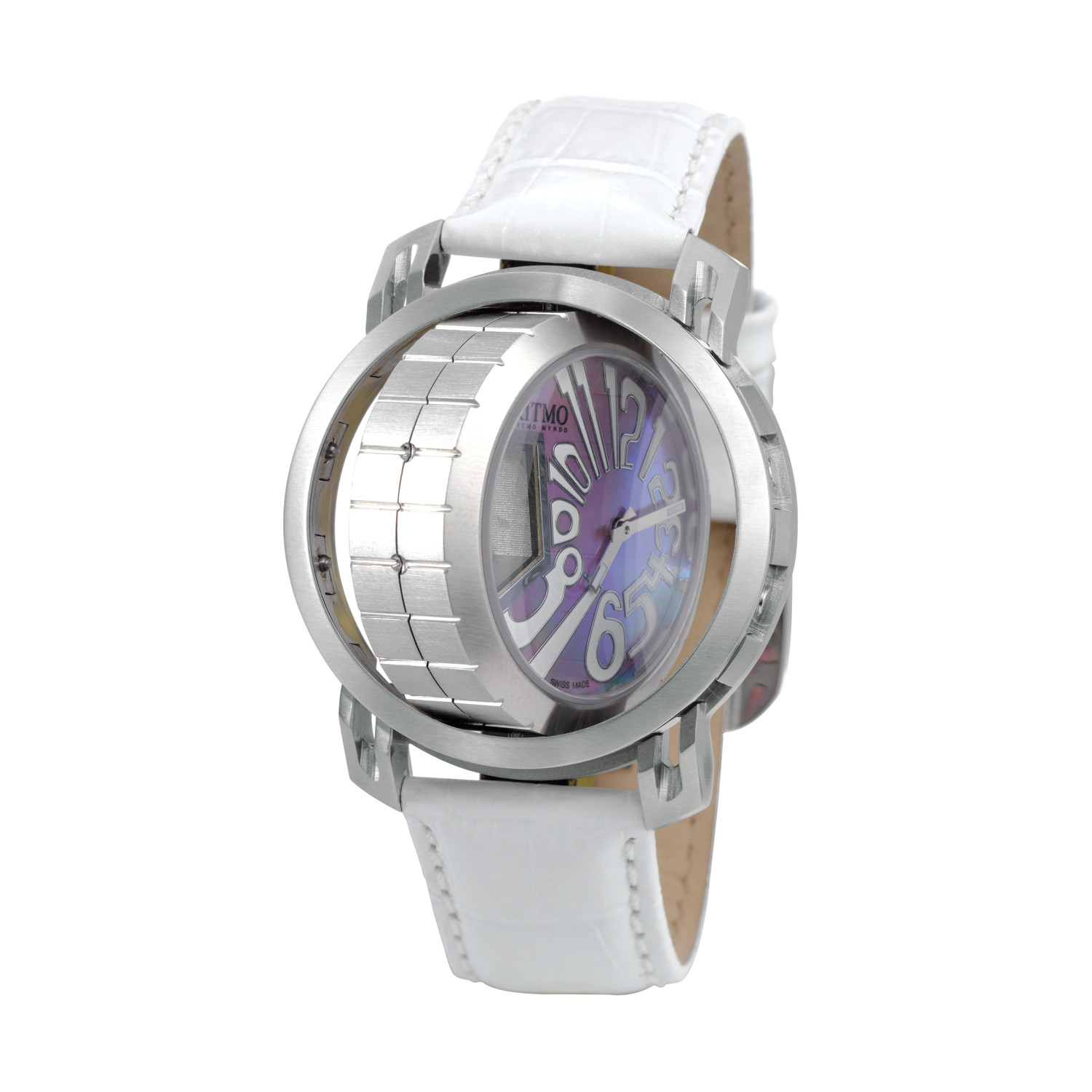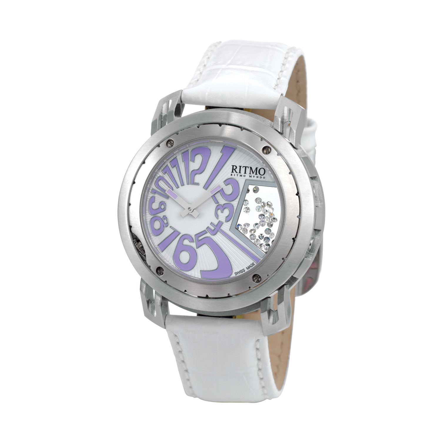 This Persepolis dual time swiss quartz watch is composed of stainless steel with a white & purple dial and purple numerals. The window has floating diamond dust and sapphire crystal with a white leather strap and buckle. This ornate watch is water resistant to 5 ATM, so a subtle splash won't harm this beautiful design.