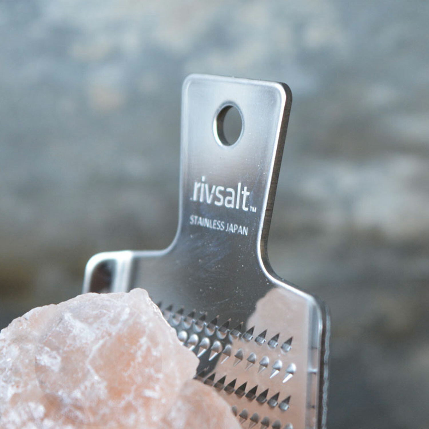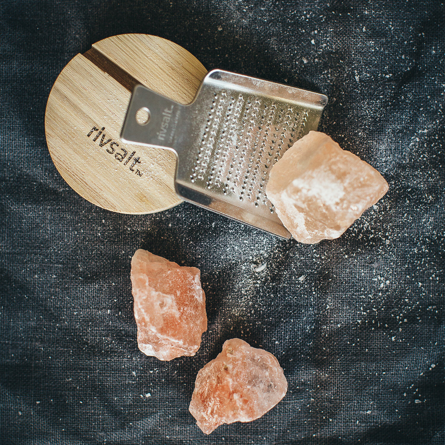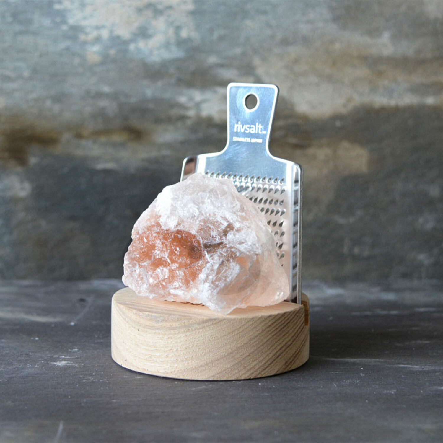 Rivsalt—or grated salt— is a gastronomic experience and a unique way to season your food. Natural Himalayan salt is grated onto the dish with a stainless steel grater. The duo becomes the centerpiece of the dining table when placed with the included natural oak desk stand.