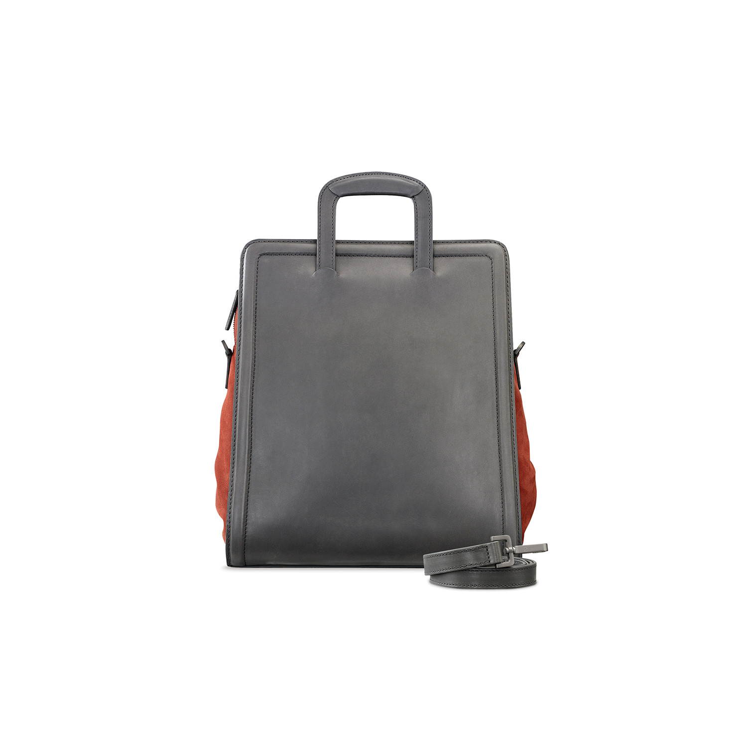 This extension of the Shift collection features a contrasting mix of suede-like nubuck leather (side panels) and smooth bridle leather (front and back panels). It also features the signature retractable handles. The larger pieces also have a detachable shoulder strap for additional flexibility.