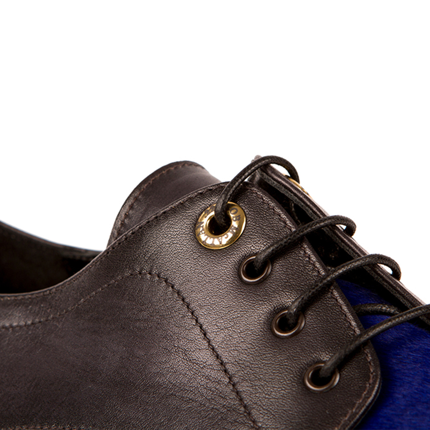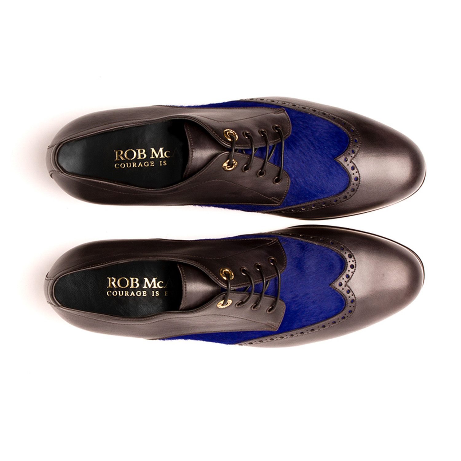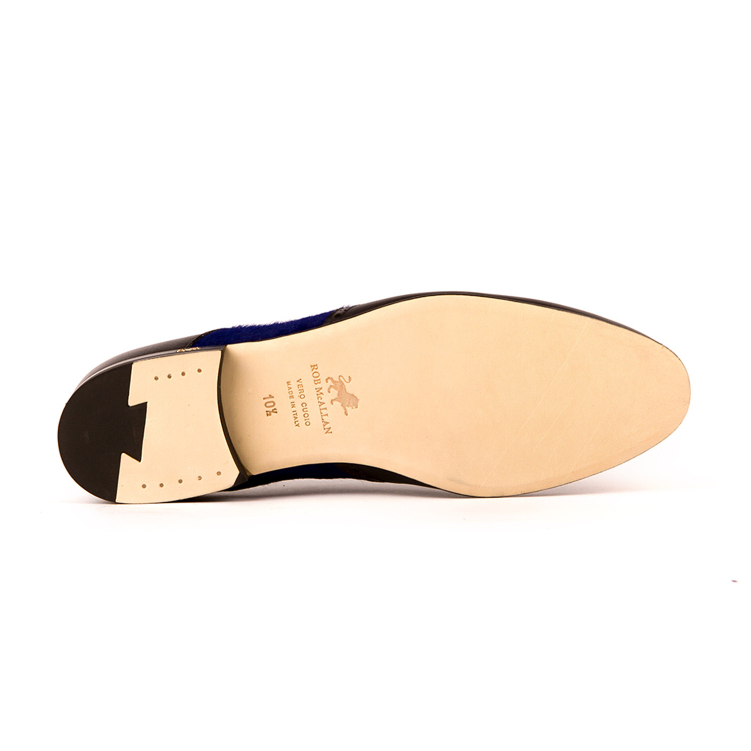 The Horseman is a sportsman oxford designed to support natural movement with lightweight construction, flexible soles, and ultra-lux breathable materials. Features include blue accented pony hair on raw natural leather, metal lion accented heels, bullet casing eyelets, flexible leather soles, and premium grade rubber infused leather heels.