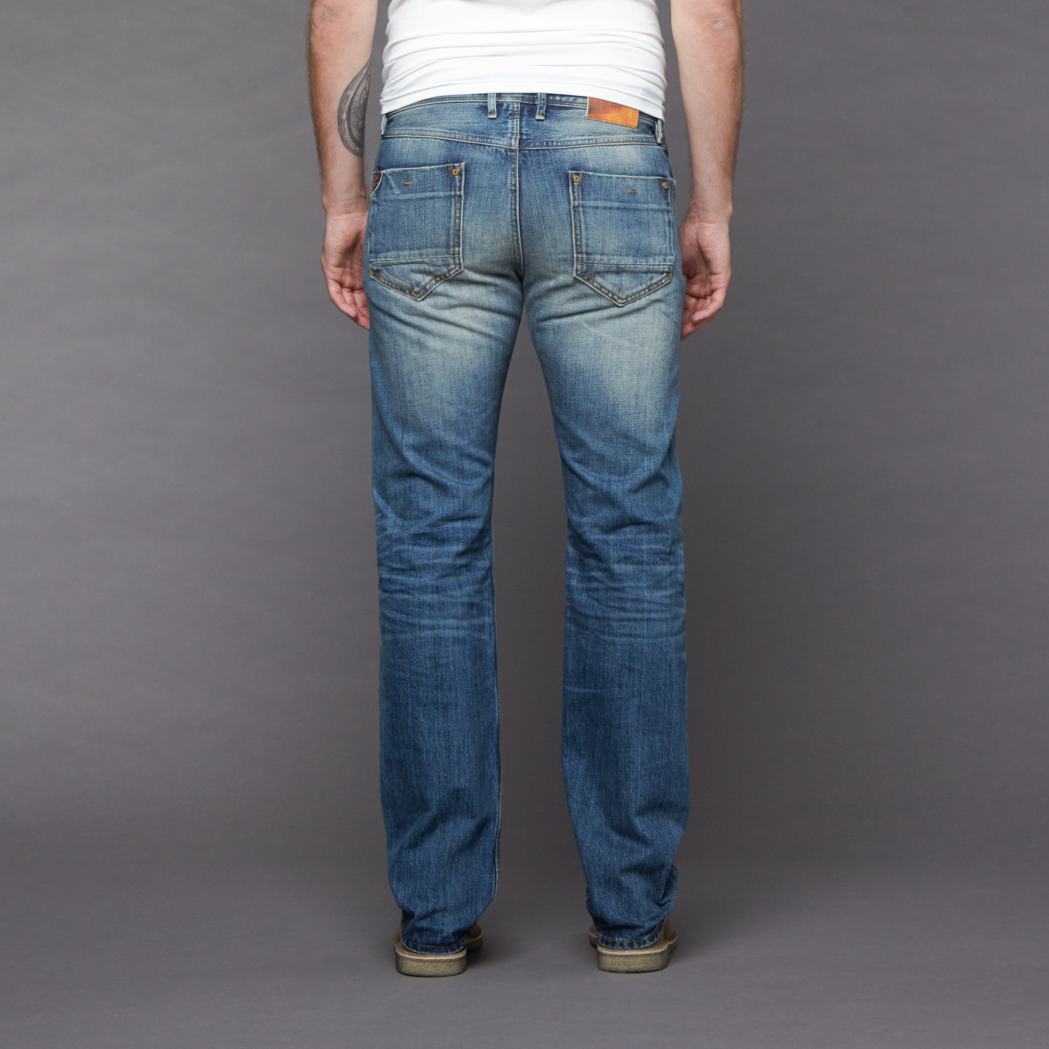 The worn-in look of the Montague Woven Denim Slim Jim is achieved by submerging a selvage denim in an all-over vintage enzyme stone wash, with added hand-sanding and whiskering. It's a vintage inflected statement.