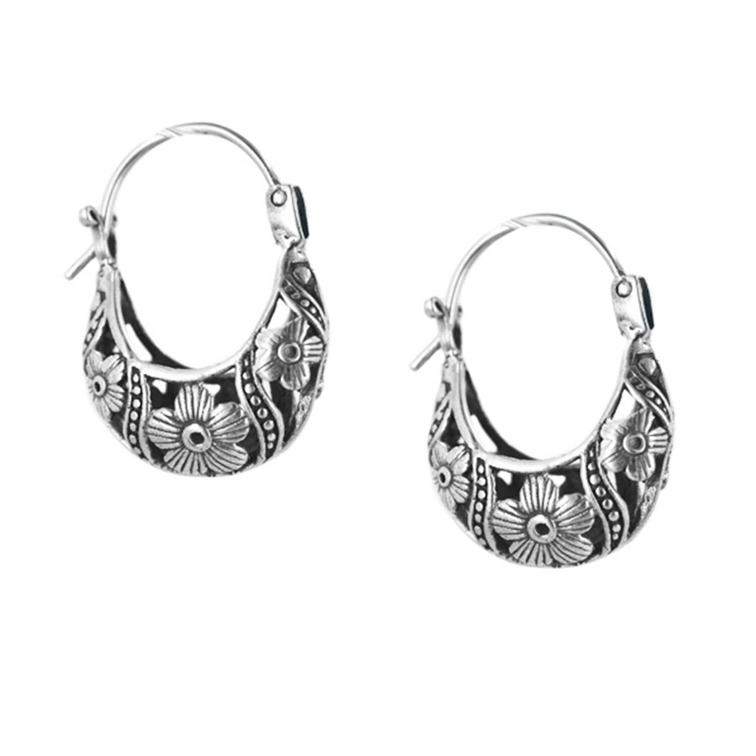 Bali Sterling Silver Floral Basket Hoop Earrings