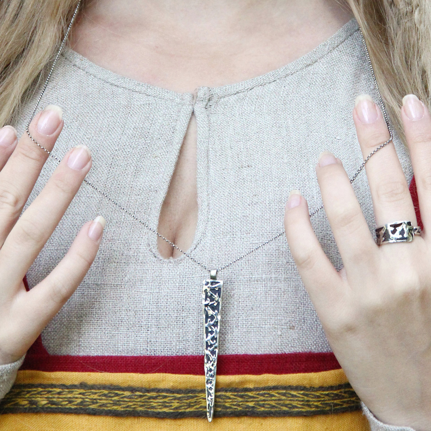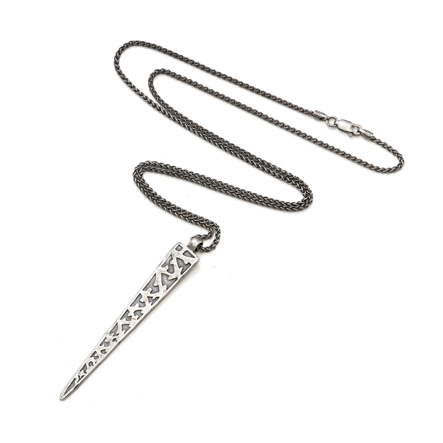 This necklace replicates an authentic 900AD Viking silver treasure buried in Lancashire, England. Stamping into flattened silver was a basic and well-used Viking Age technique. Many jewelry pieces were decorated with patterns of triangles, dashes, and dots made by hammering the top of a shaped die into the surface of the metal. This piece replicates that style while still looking modern and stylish.