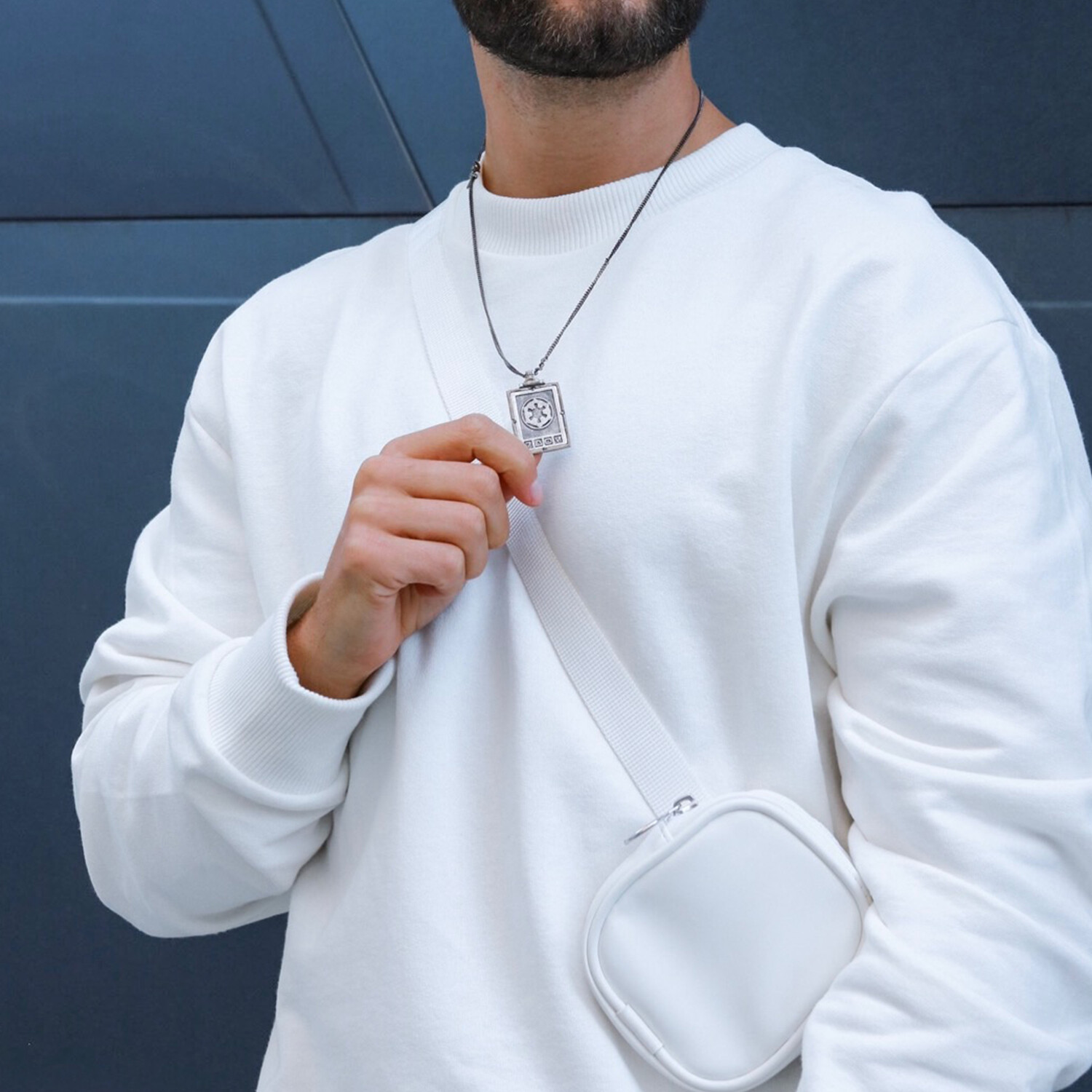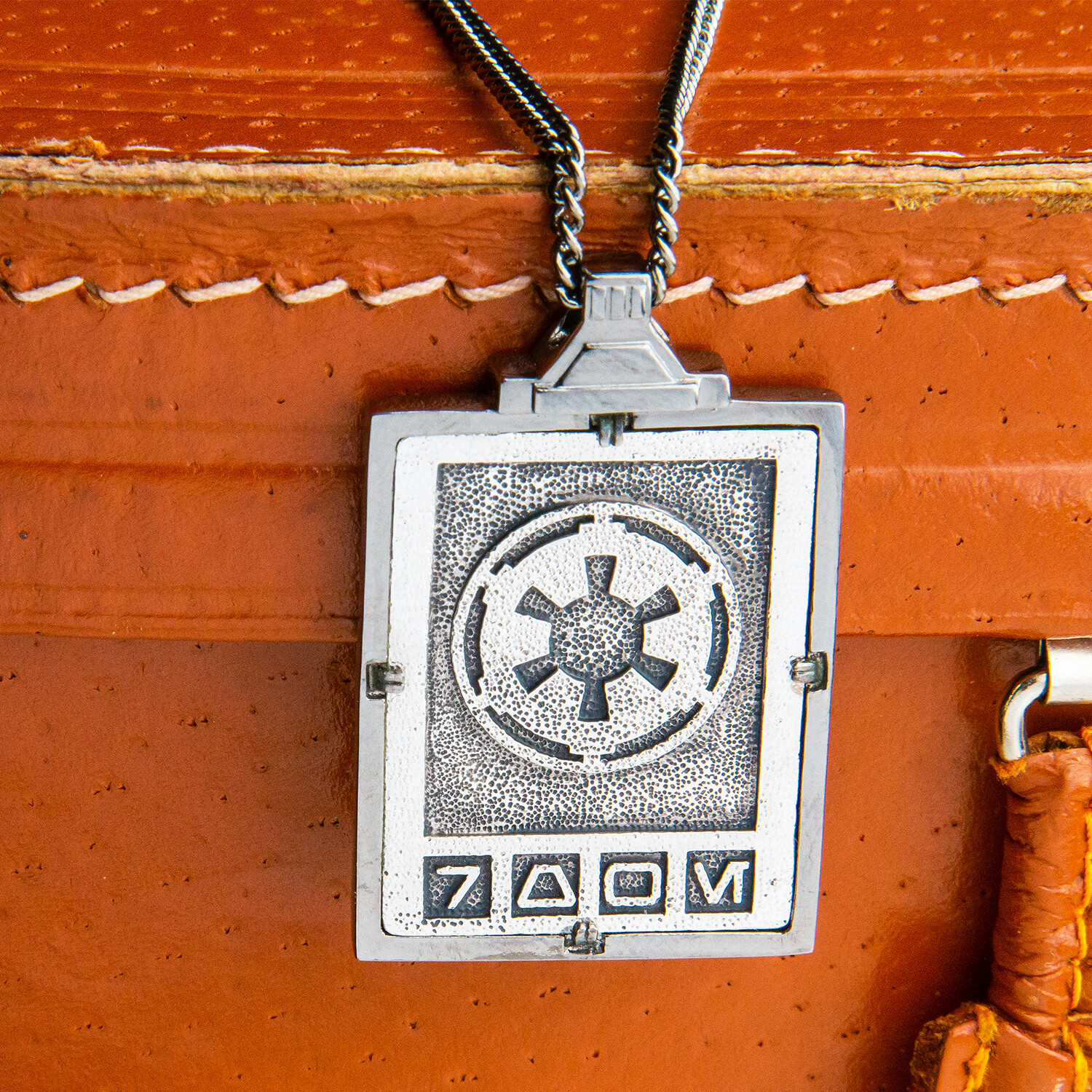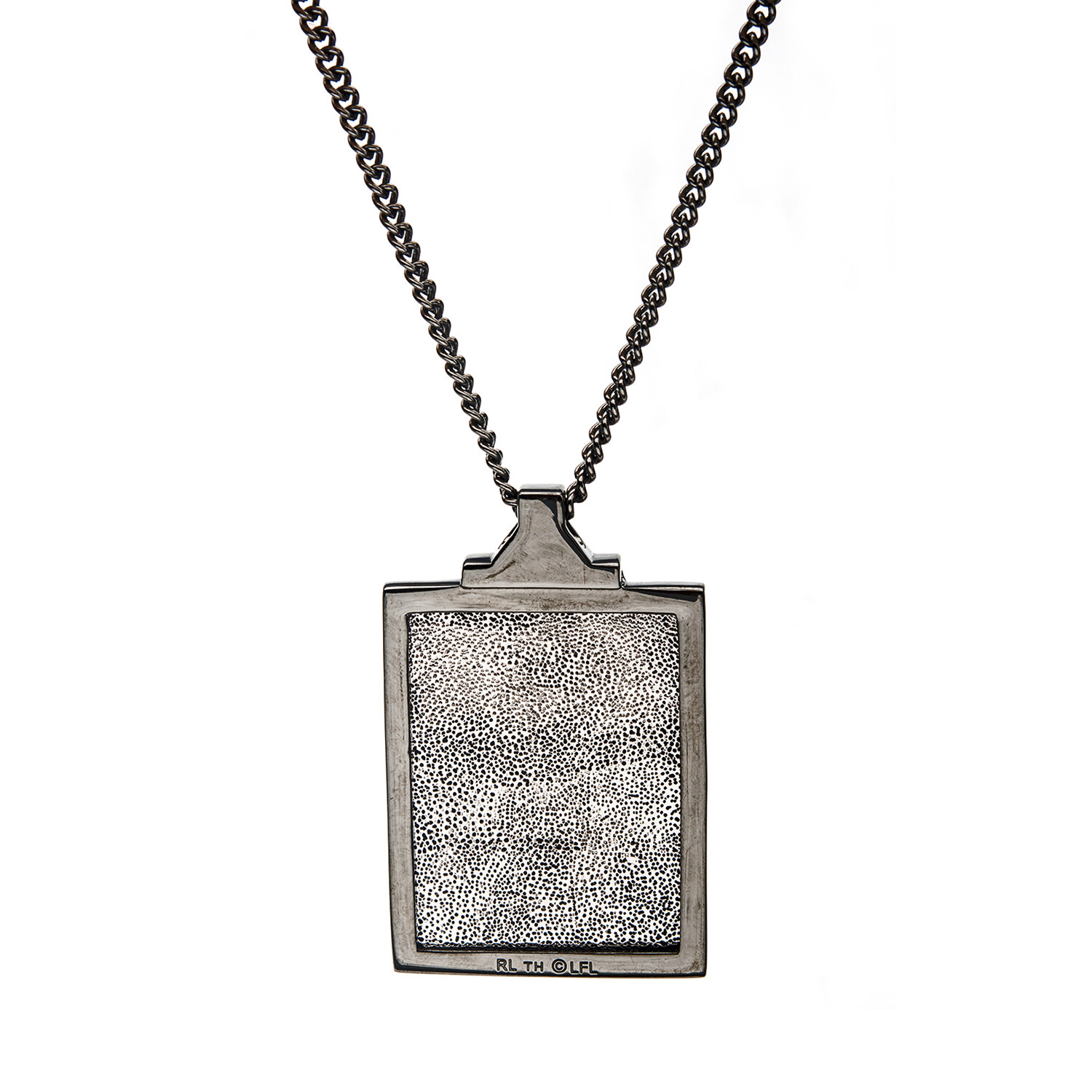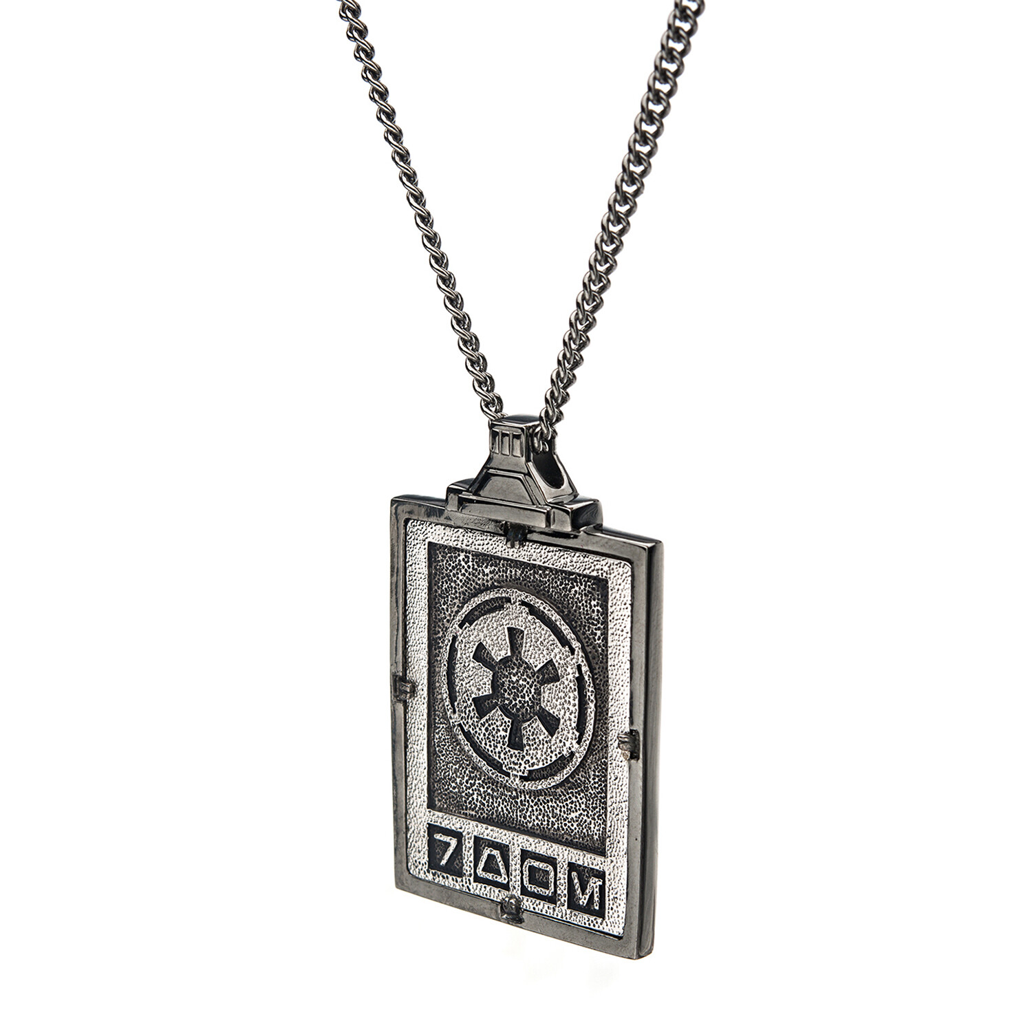 Sculpted in solid artisan brass, an antiqued silver-plated Imperial Credit is set within a black rhodium pendant frame. Inspired by ancient coin jewelry, this relic from a galaxy far, far away is crafted from two separate parts. The frame securely protects the unaltered credit, ready to “pay off” bounty hunters. Intentional detail and distressed stippled texture, the rectangular pendant hangs from a heavy adjustable 24 inch black rhodium plated brass curb chain.
