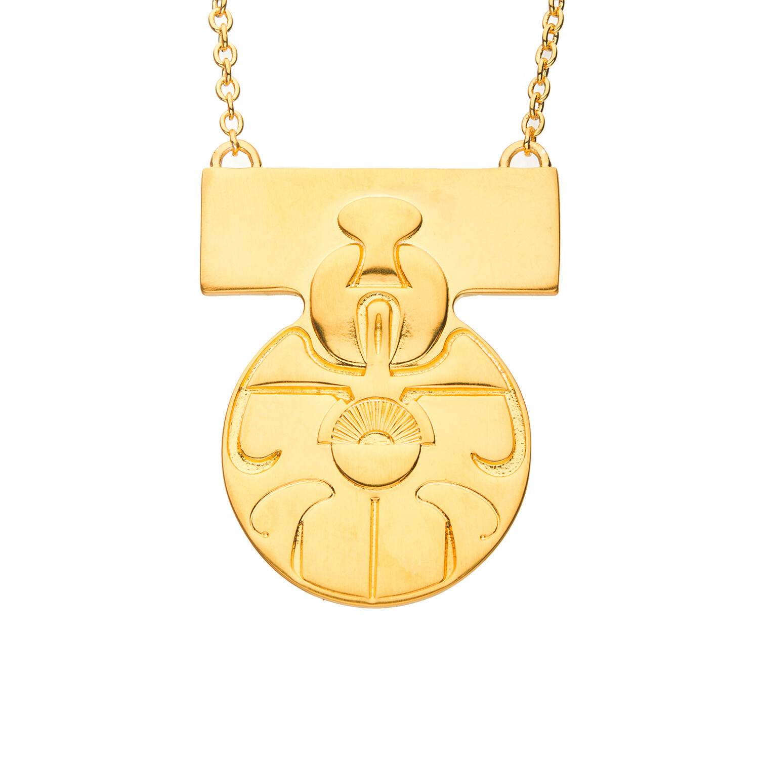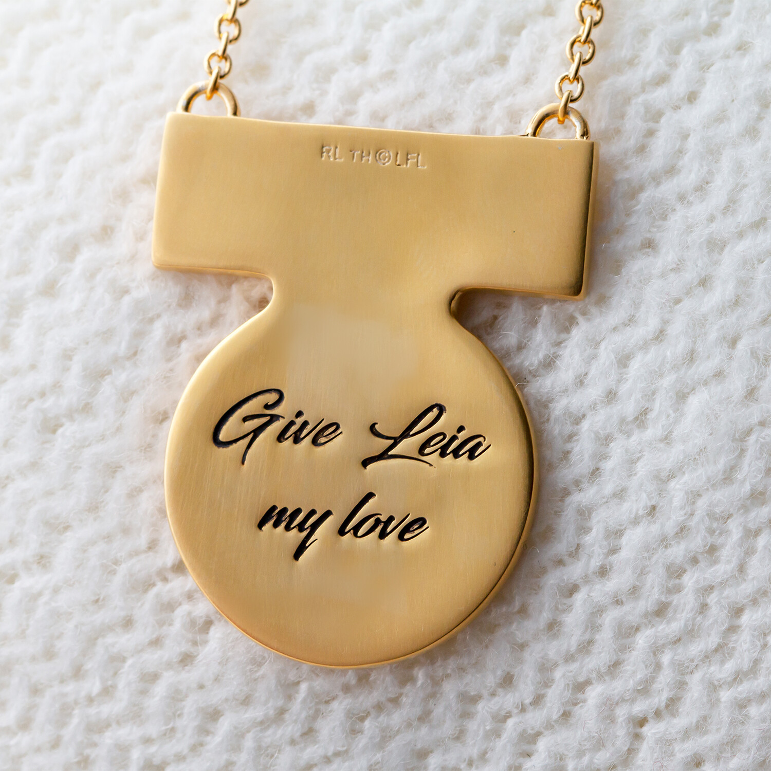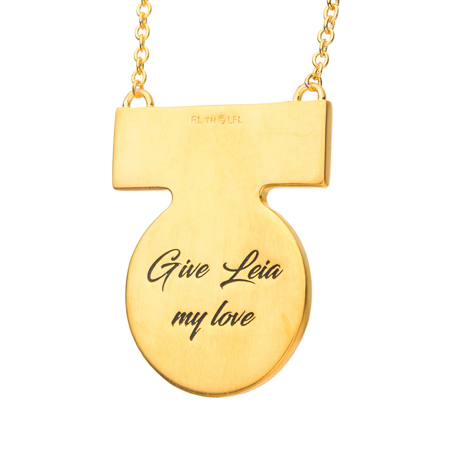 Sculpted in solid artisan brass and plated in warm yellow gold, the Medal of Yavin Necklace is inspired by the iconic medal bestowed by Princess Leia. Translated for more comfortable daywear, the medal substantial carving, with the sentimental homage "Give Leia My Love" engraved on the reverse. The medal has a brushed satin finish and hangs from a matching 20 inch yellow gold-plated brass cable chain, imitating the length of the on-screen prop.