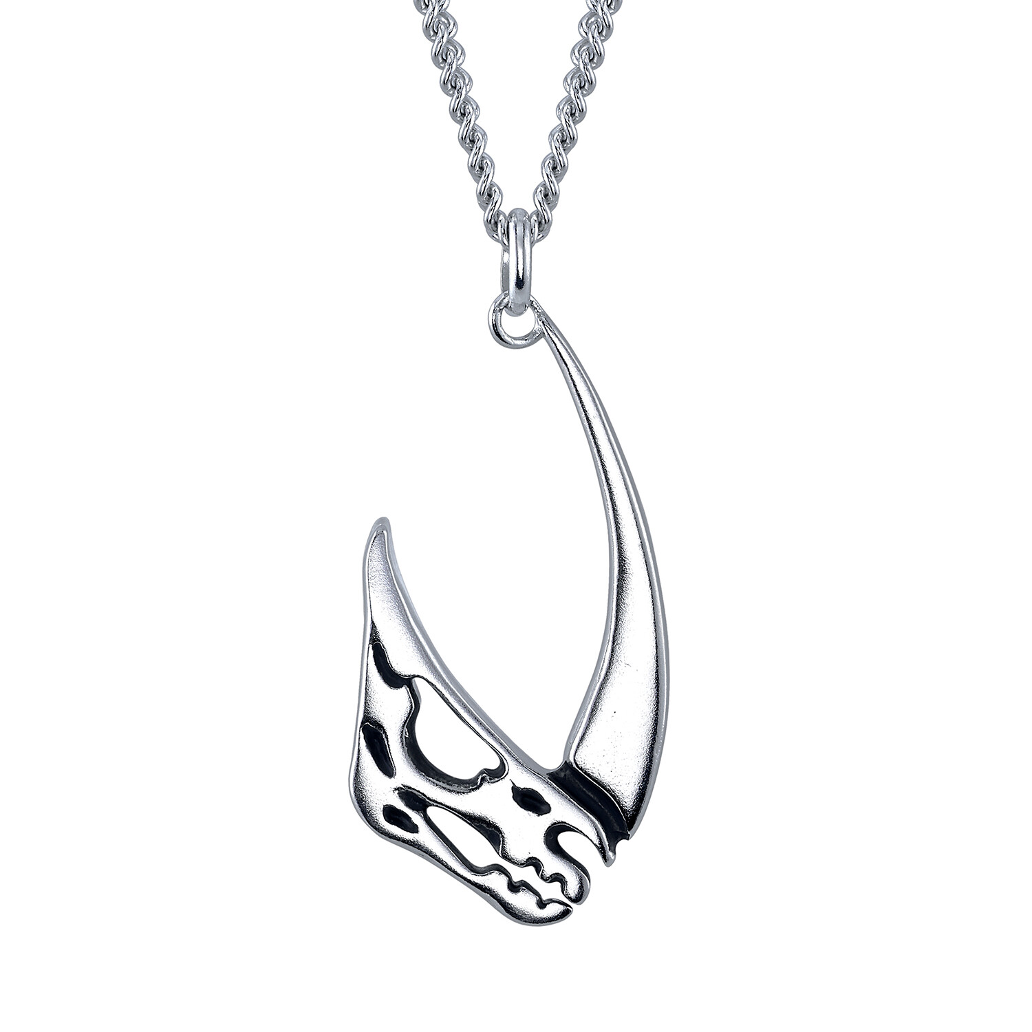 Sculpted in solid sterling silver, The Mandalorian Din Djarin’s Mudhorn Clan Signet is reversible – choose to wear the engraved motto "Clan of Two" facing outward for all to see or hidden privately against the body. Sleek and simple, with antiquing to emphasize contrast, the pendant hangs from a heavy adjustable 24 inch sterling silver curb chain.