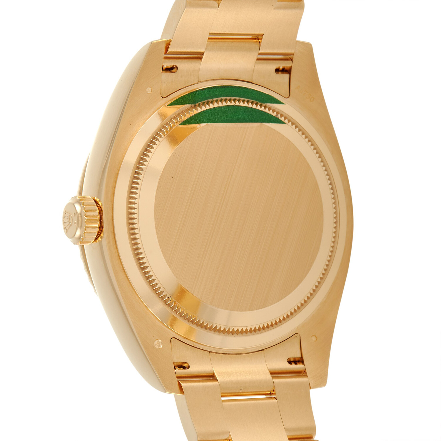 The Rolex Sky-Dweller is a pilot's watch that perfectly combines luxury and functionality. On this watch, you’ll find a sleek case, fluted bezel, and bracelet made from opulent 18K Yellow Gold. The black dial comes complete with luminous gold-toned hands, luminous index markers, a 24-hour dial at the center, a second time zone indicator around the outer edge, and a date dial located at the 3-o'clock position.