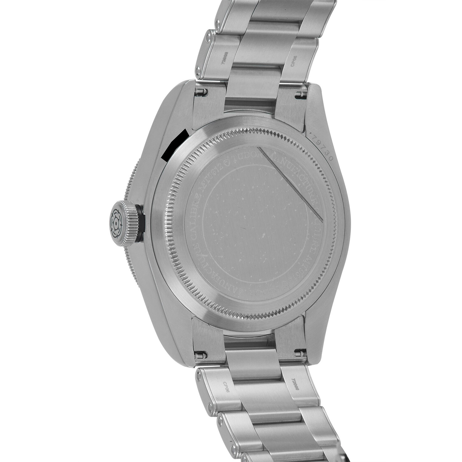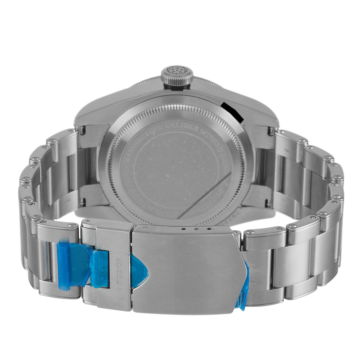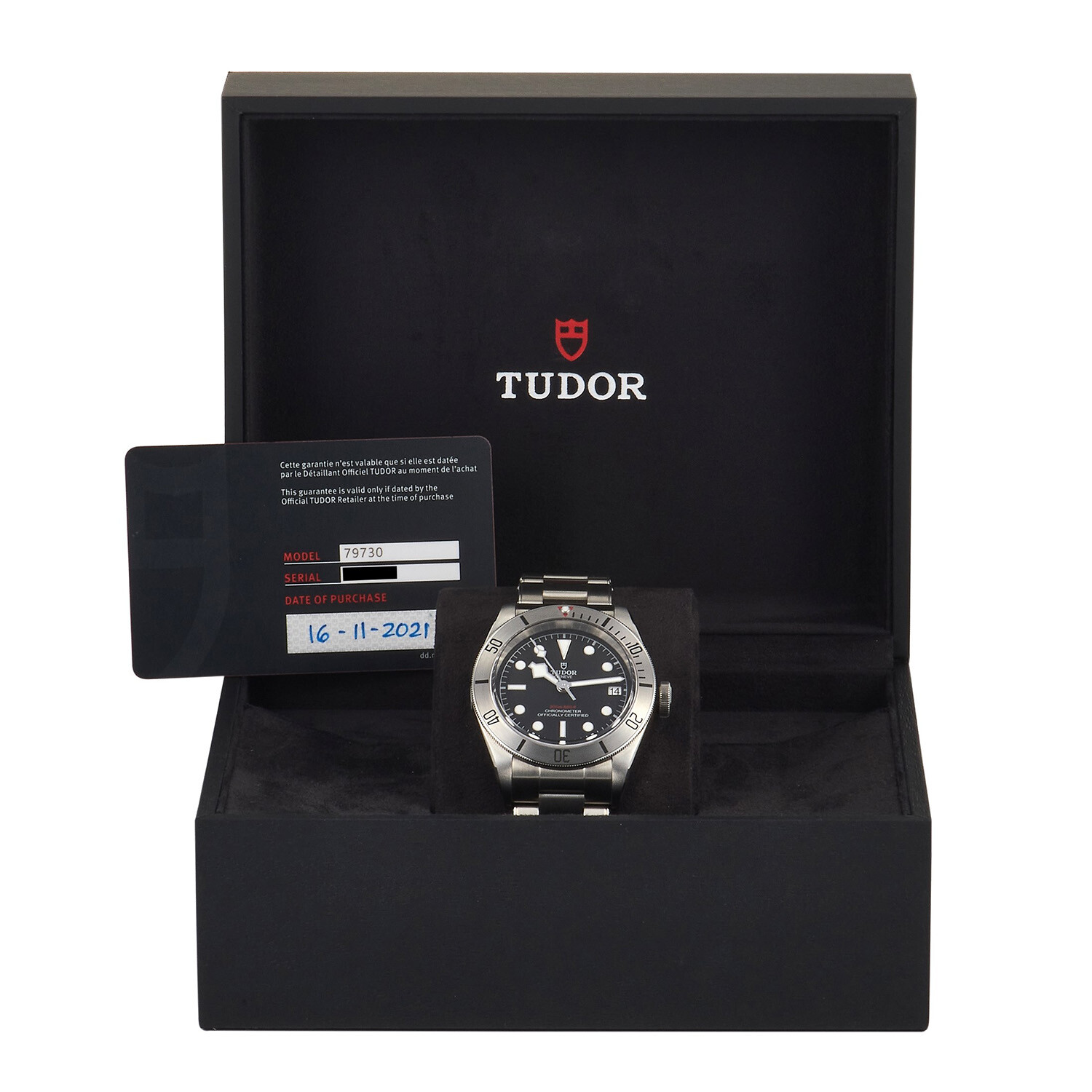 This Tudor Black Bay Watch, reference number 79730, features a stainless steel case measuring 41 mm in diameter with a unidirectional rotating bezel. It is presented on a matching stainless steel bracelet with folding clasp. The black dial displays hours, minutes, seconds, and the date at the 3 o’clock position. This model is equipped with caliber MT5612 (COSC) automatic movement and builds up a power reserve of 70 hours. The watch is water-resistant to 200 meters.