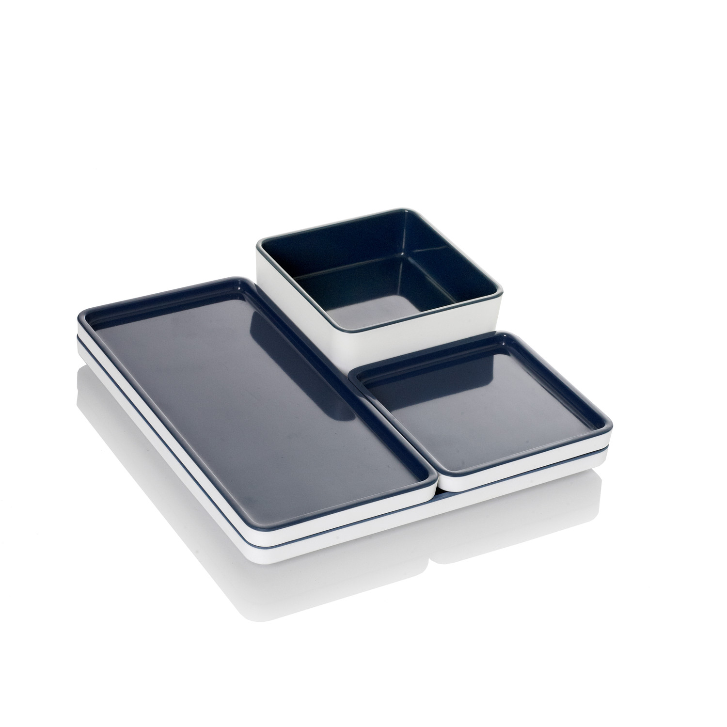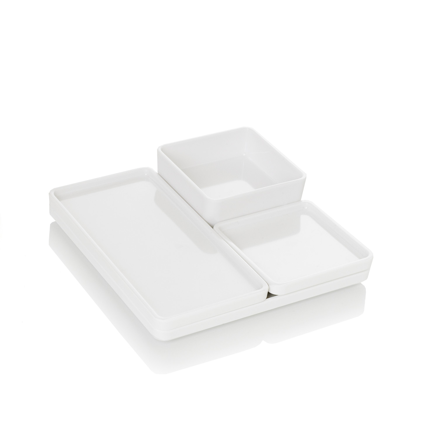 This modular set is futuristic and high gloss with compartments to complement your snack time ritual. This set includes a large tray, medium tray, small tray, and small dip bowl for munching and loungin' in colorful style.