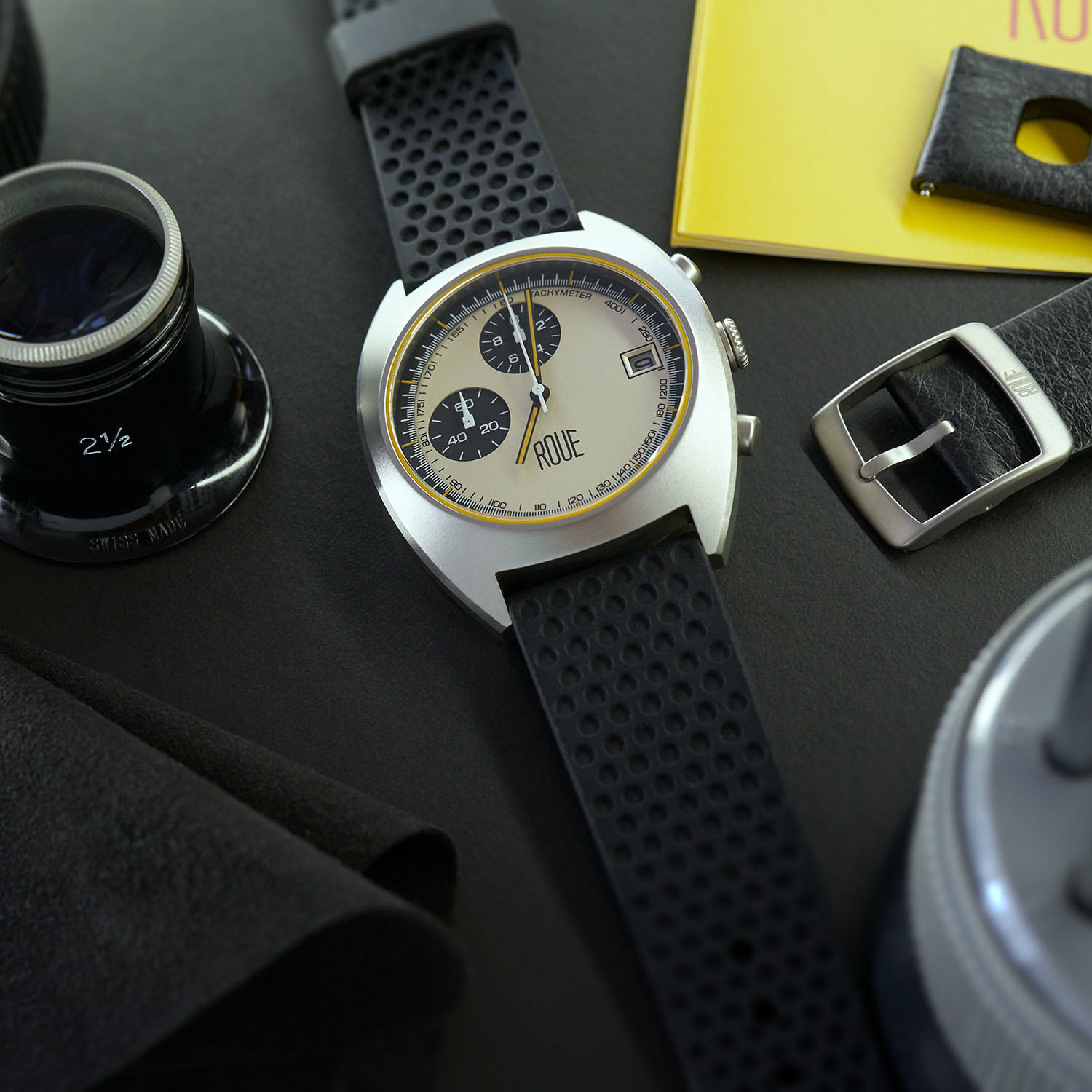 A tribute to those who make their mark, the CHR Chronograph is influenced by the 1970s. It draws from the golden days of Hunt, Lauda and Fittipaldi, and iconic motorsports cars like the psychedelic Porsche 917 and Ferrari 512M. Or the quirky Lancia Stratos and the concept Mercedes C111, preferably in orange. It's an homage to the first decade of the modern automobile era.