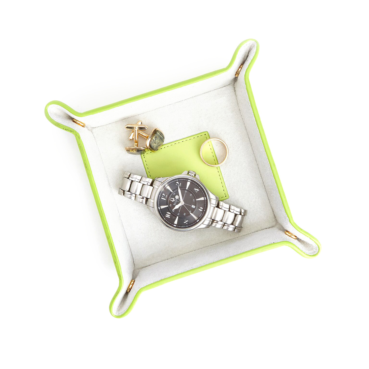 With an ingenious full grain leather design and a luxury suede interior, the Catchall Valet Tray is perfect for traveling. It packs flat for your journey, then snaps together once you arrive to hold your jewelry, coins, and keys all in one simple spot.