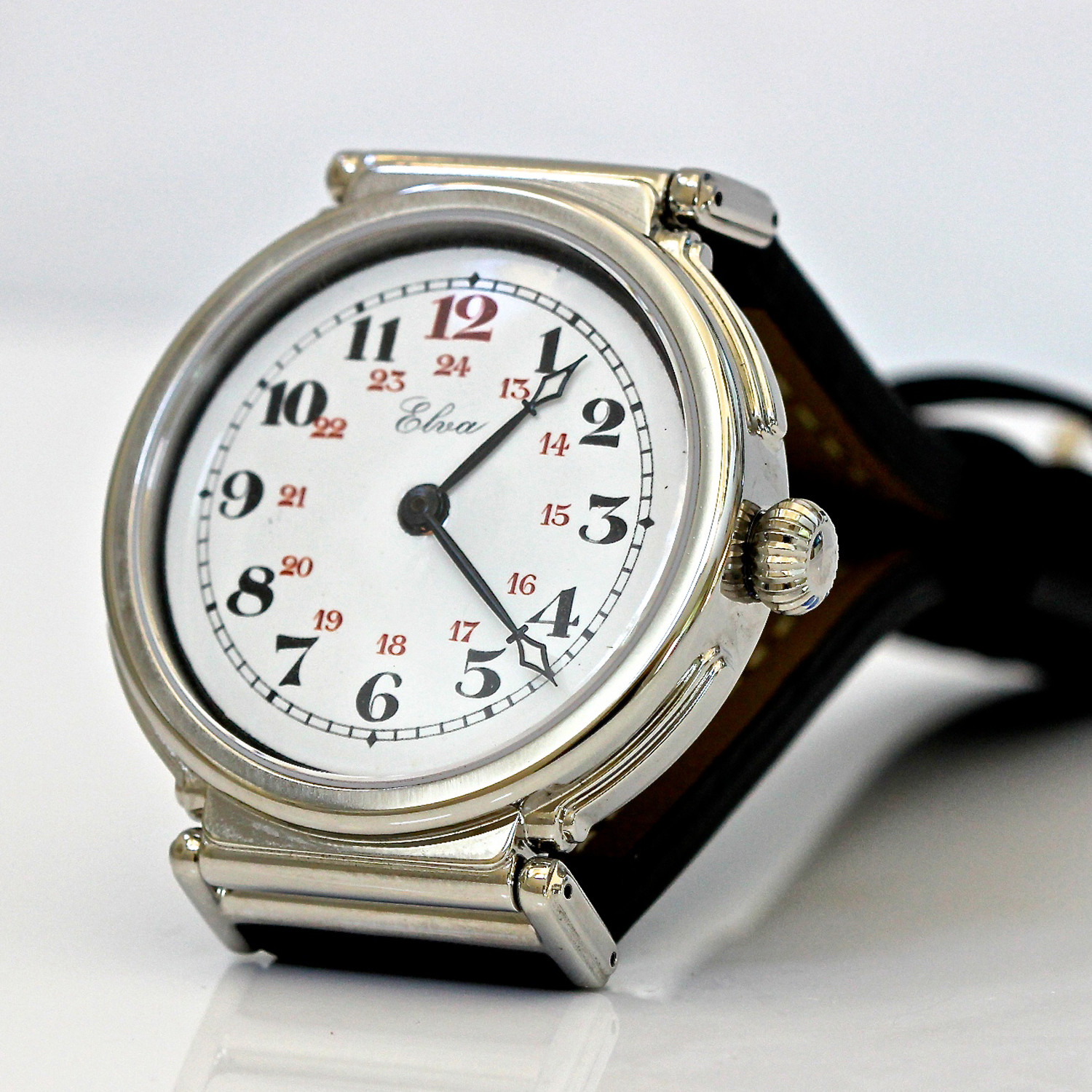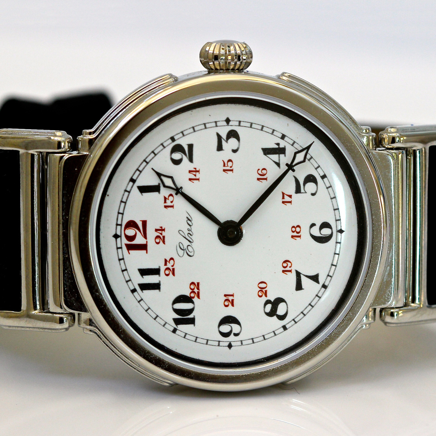 — Dial: Antique Unusual Swiss Enamel Dial With 24 Hour Arabic Numbers Black “cathedral” Style Hands With Luminous Tips