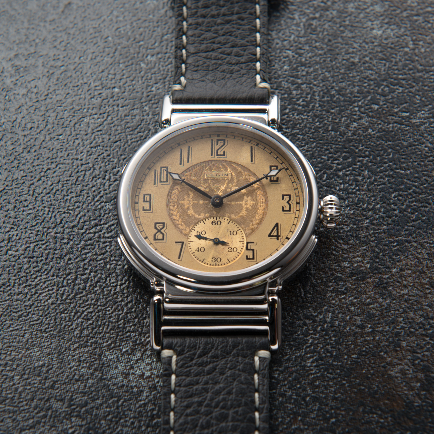 — Dial: Antique Elgin Gold Toned Dial With Embossing And Guilloche. Black “cathedral” Style Hands With Luminous Tips. Antique Blued Steel Second Hand