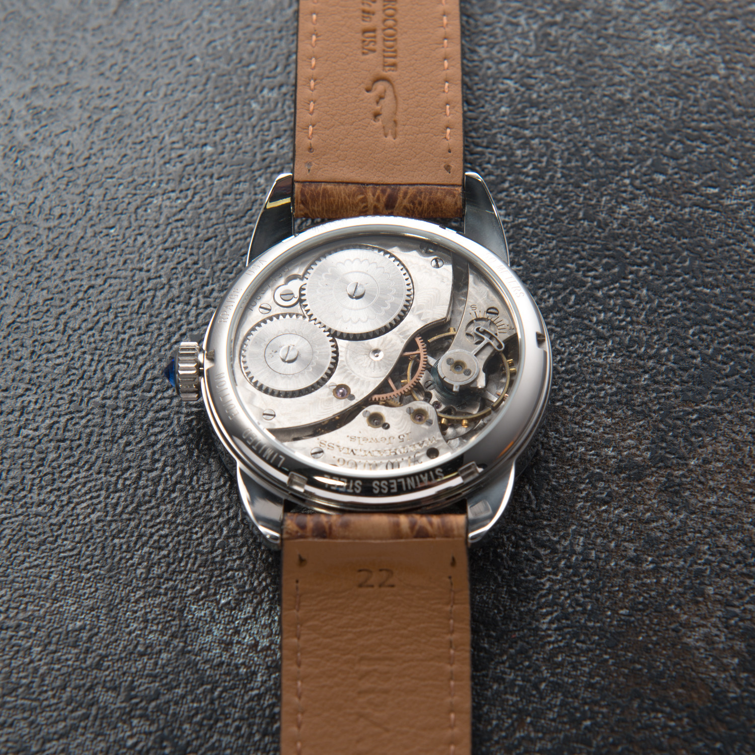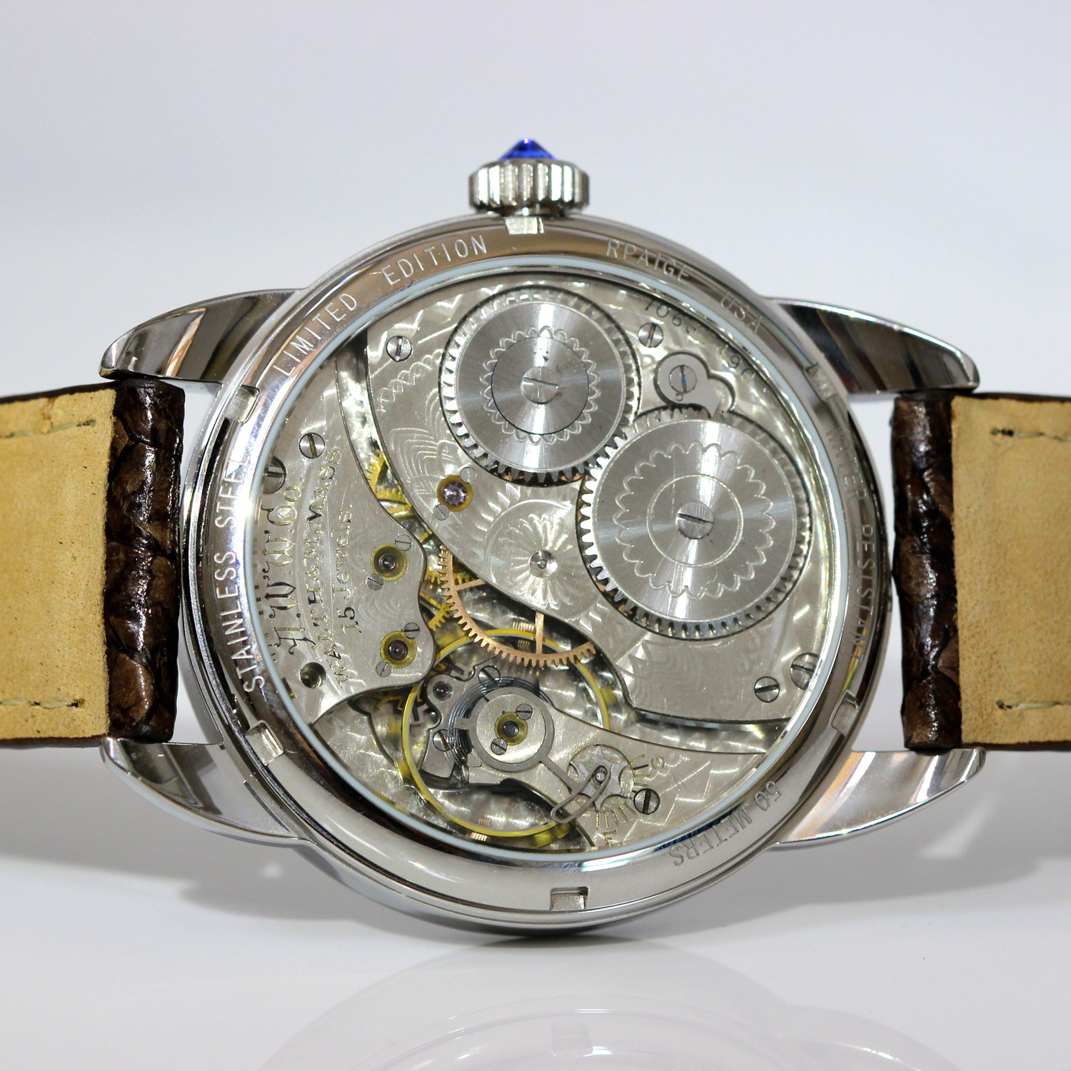 The RPaige Wrocket has been almost a year in the making, and it was very challenging design to create and manufacture. The difficulty was re-engineering the highly intricate “carousel” seconds subdial to fit on the antique/vintage mechanical movement and still allow for second hand wheel to rotate freely underneath the new dial. The designer decided to use only one manufacturer for the movement to keep consistency in the movement engineering, and the best of those was obviously the Waltham pocket watch movement.