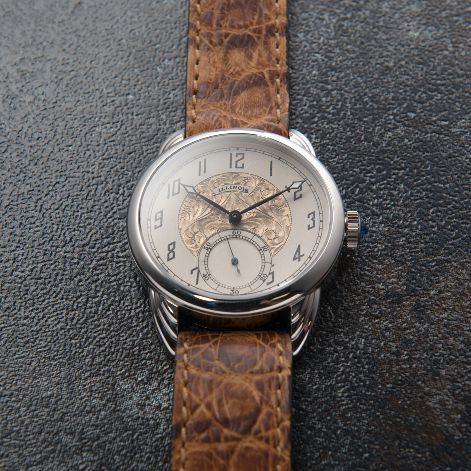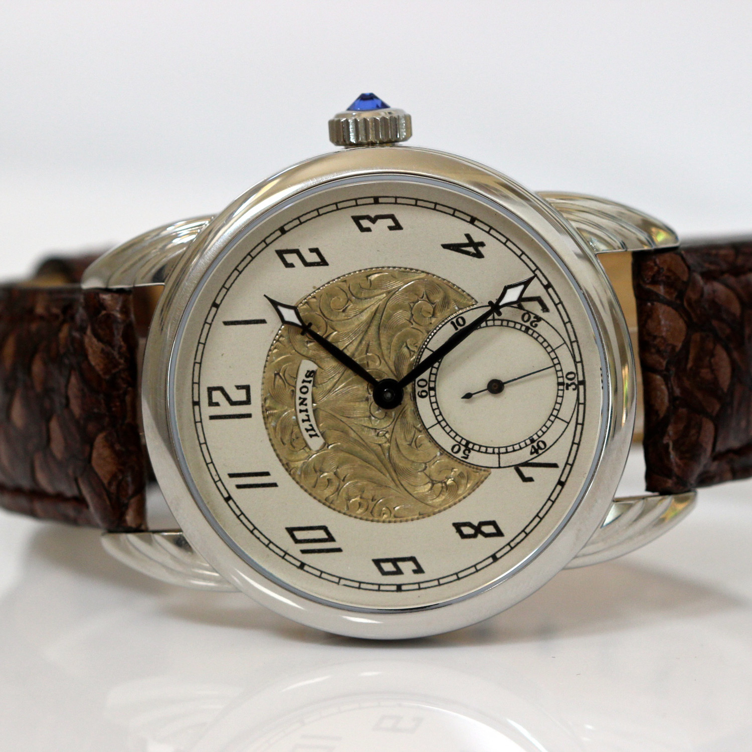 — Dial: Antique Illinois, Two Tone, With Engraved Gold Finished Center. Fancy Arabic Numbers. Black Cathedral Hands With Luminous Tips.