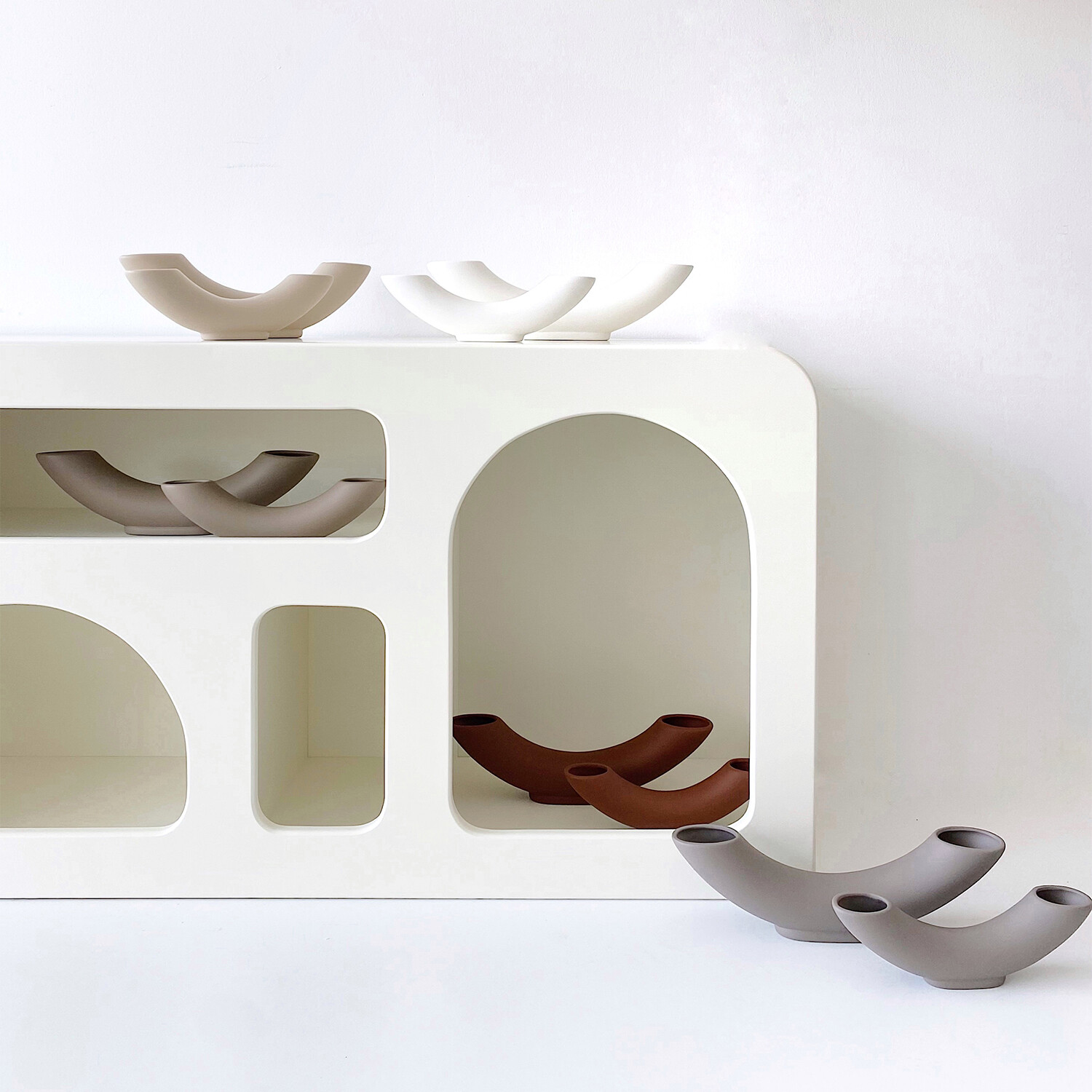 Add a modern touch to any room with this collection of ceramic vases and decorative objects. Each simple yet sleek design features smooth lines and unconventional shapes for an elegant addition to your existing decor style.