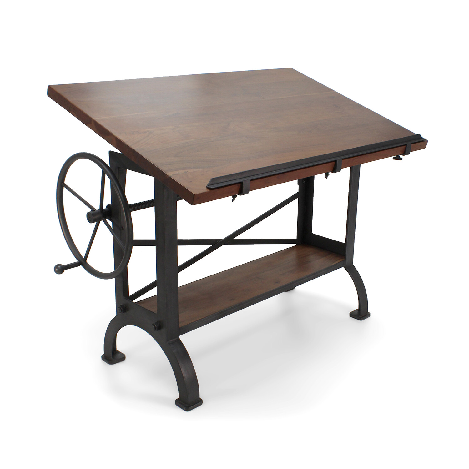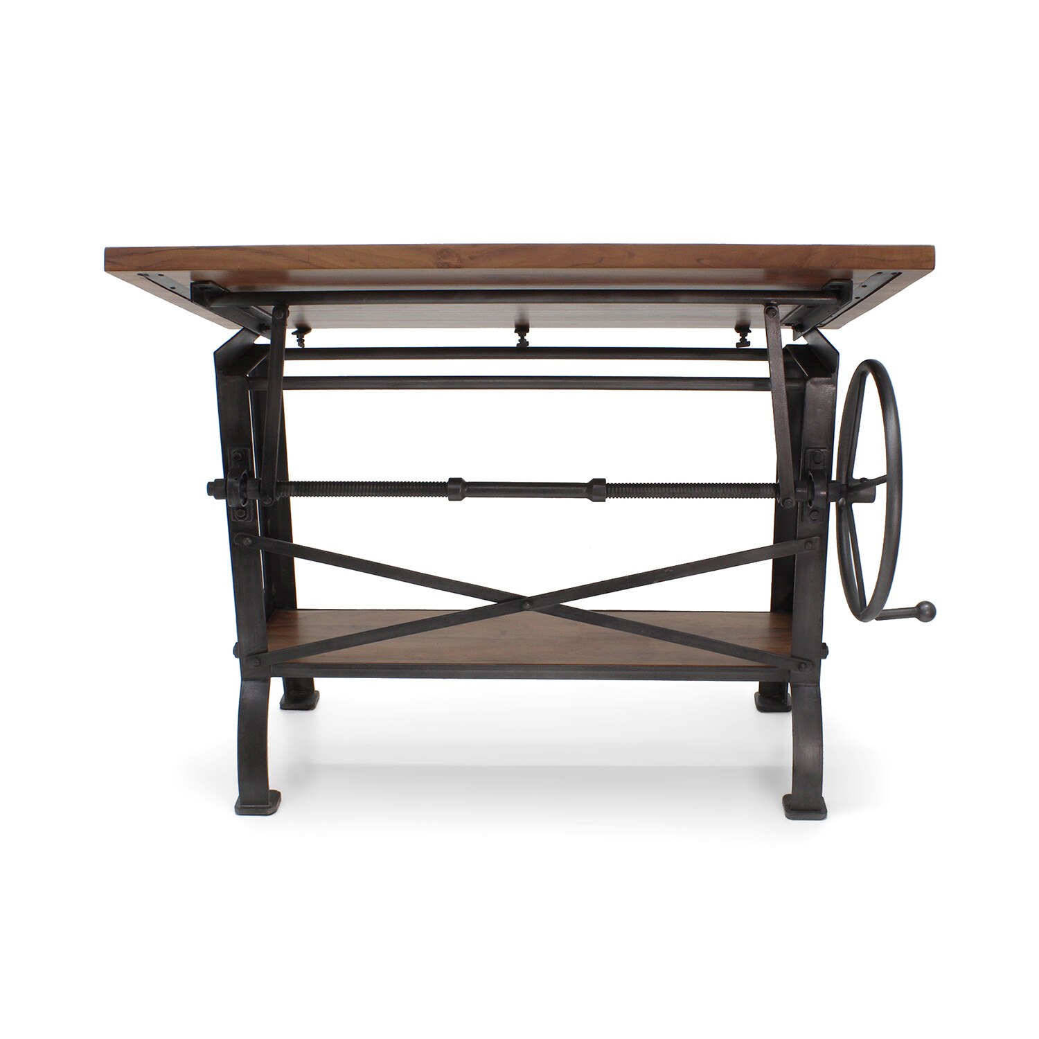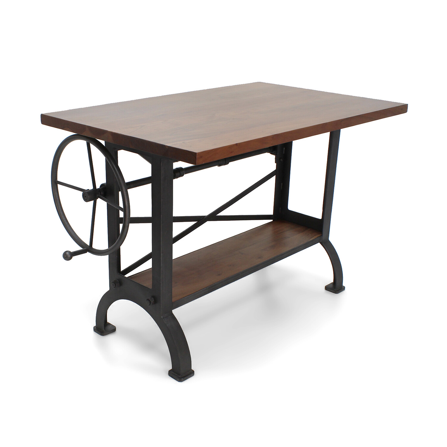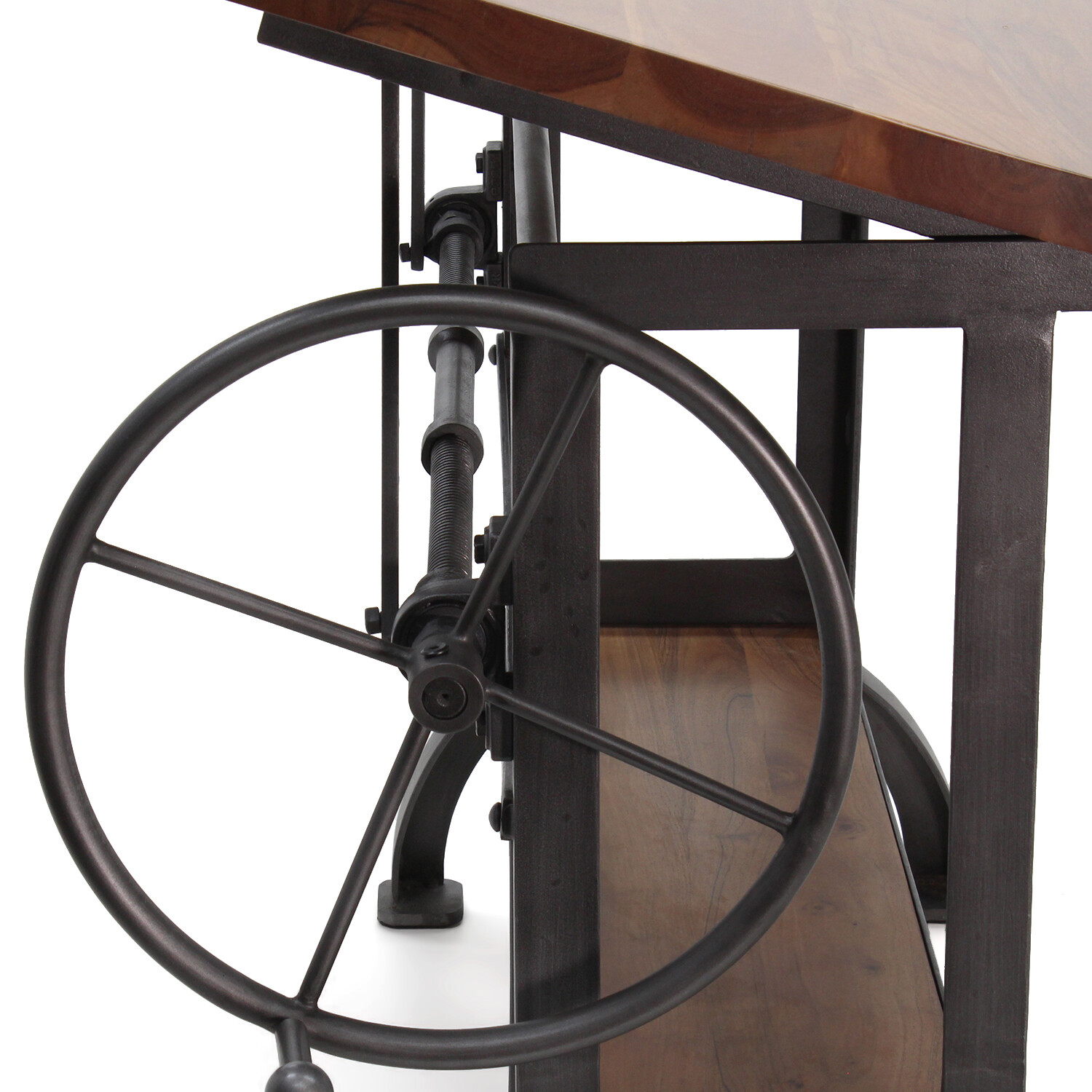Inspired by the amazing machining done during the heyday of the American Industrial Revolution, this Industrial Vintage Tilt Crank Drafting Desk features cast and wrought iron in a clean, industrial, eye-grabber. The hand-cranked wheel effortlessly raises and lowers the 1.5" thick smooth acacia top in provincial stain atop the solid steel frame.