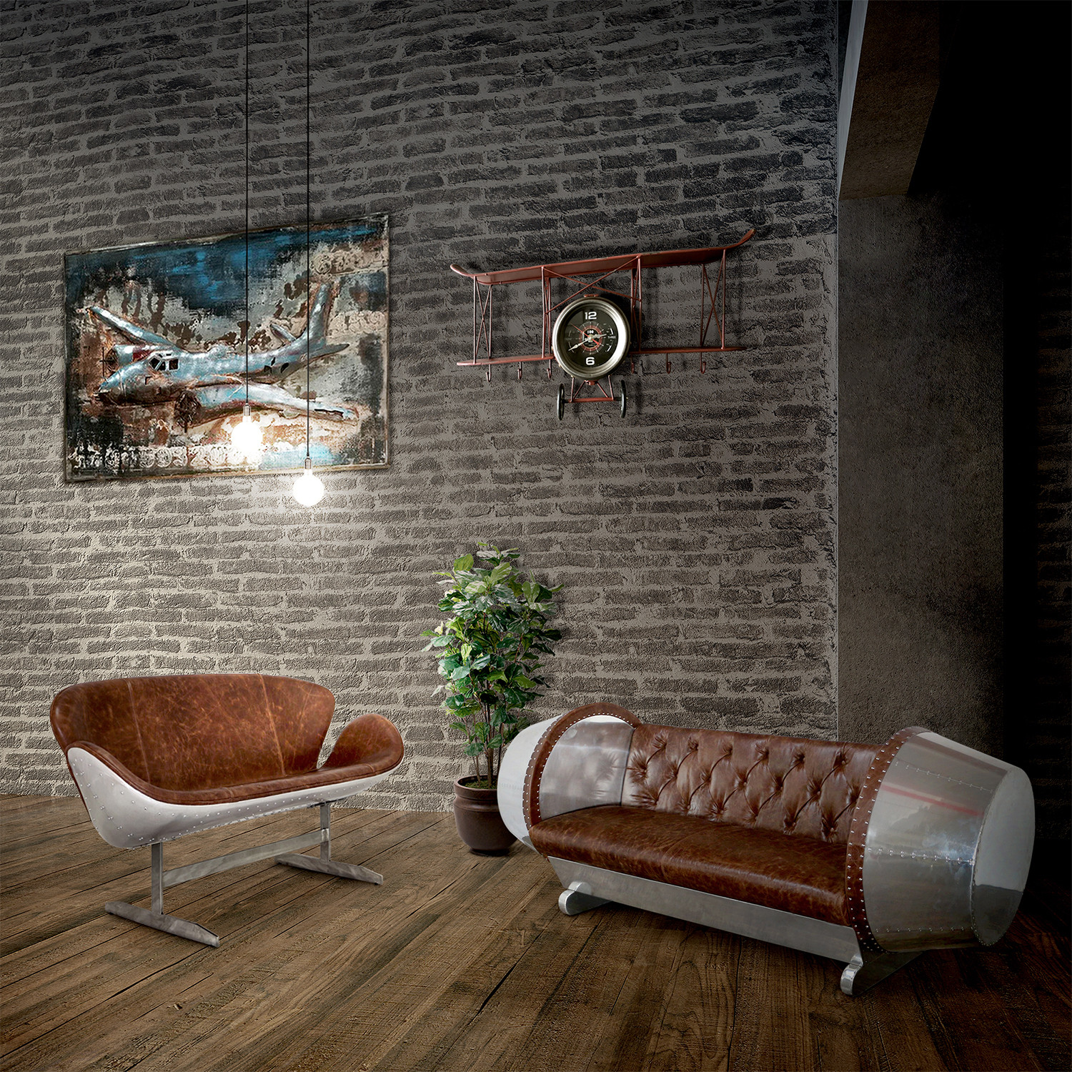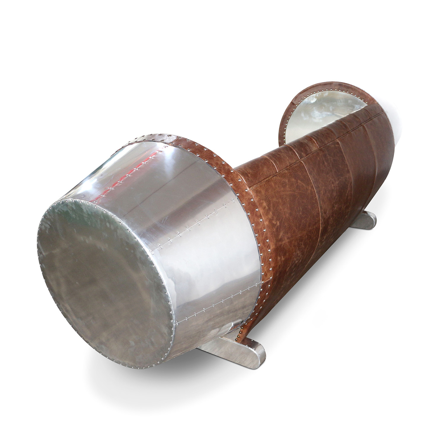 This two-seat aviator sofa was inspired by the iconic aircraft of WWII. Distressed, brown tufted leather, situated in a simulated turbo-engine housing, invites navigators to climb aboard and be surrounded by comfort. Handcrafted and brilliant aluminum envelops the sofa's high-quality solid wood frame. The polished aircraft-grade aluminum is firmly attached by visible stainless steel screws to simulate the riveting on the outer carapace of legendary war planes. Sleek with an aerodynamic profile, this aviator sofa will be an attention-grabber for years.