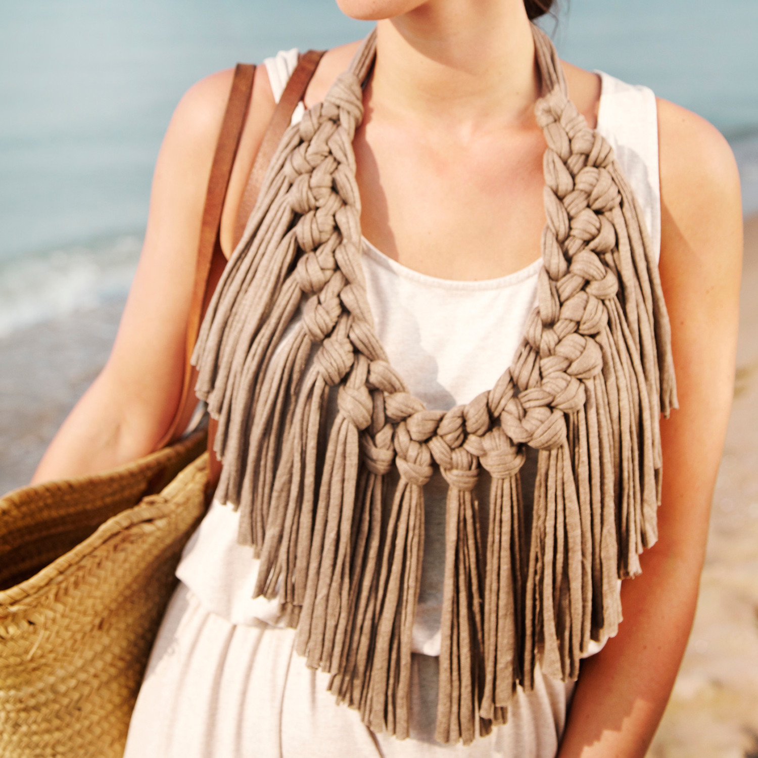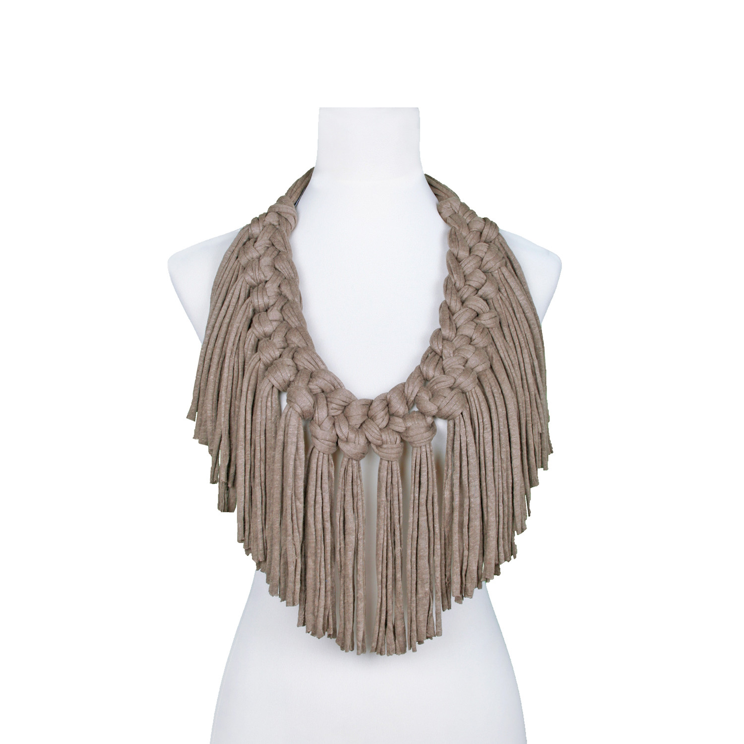 Celebrate hippie style with the Indie—a braided and fringe necklace that adds intrigue to your look. This piece is dramatic and not for the faint of heart.