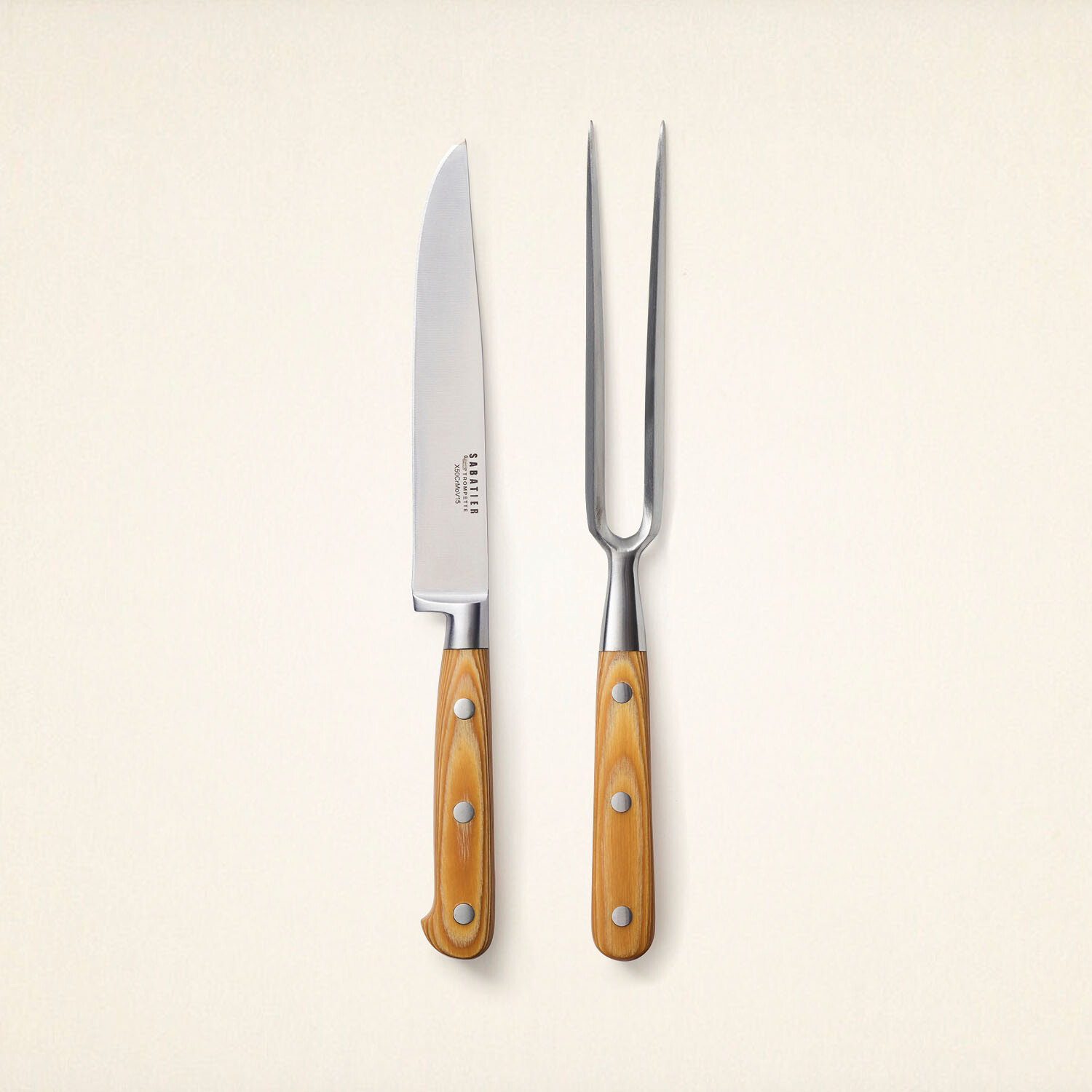 The Sabatier Carving Knife & Fork Set is the perfect companion to any dinner or holiday party and are in fact essential to any home kitchen. Made from high-quality stainless steel, the blades have been enriched with carbon for a smooth, sharp edge. The resin-enriched pakkawood handles are also antibacterial and dishwasher safe.