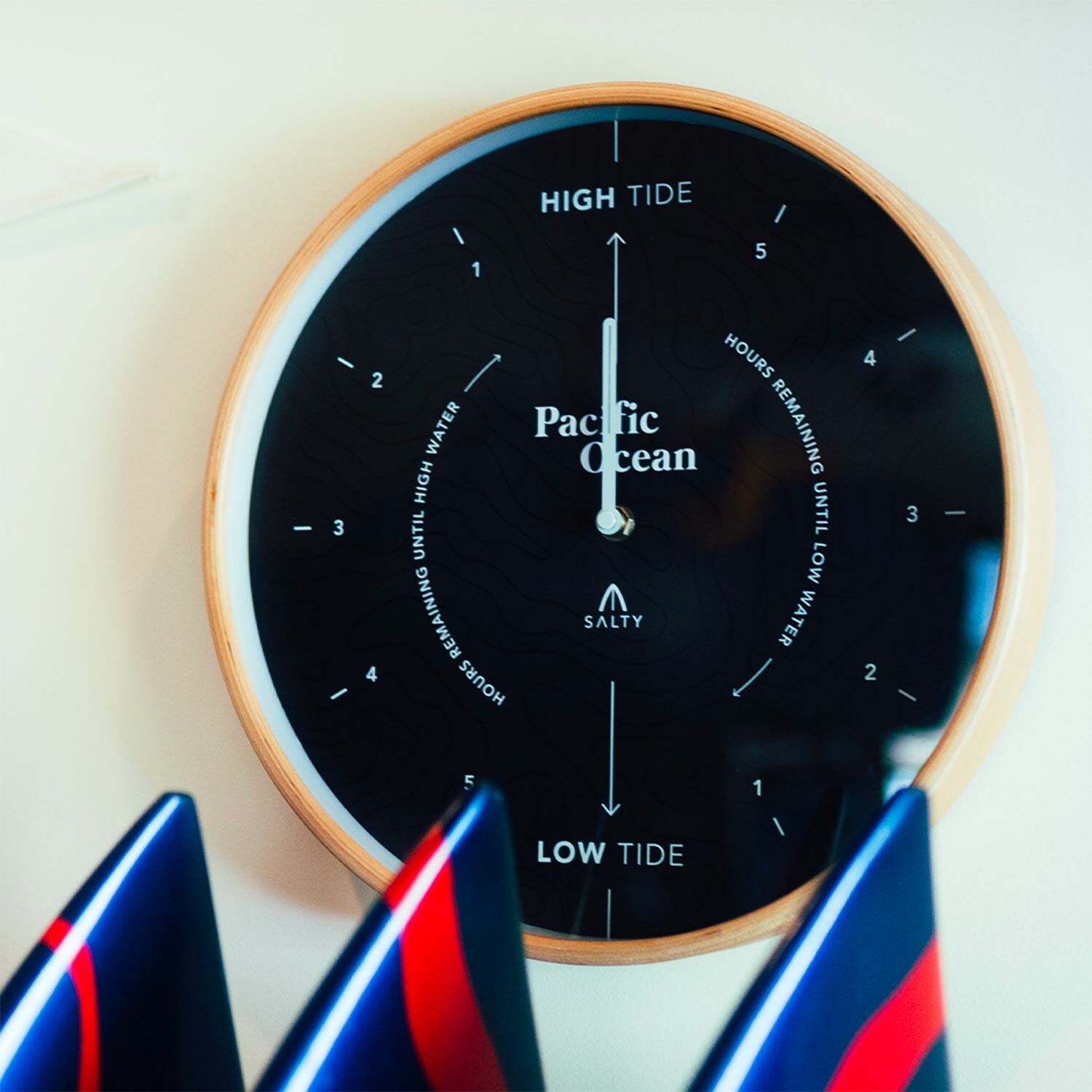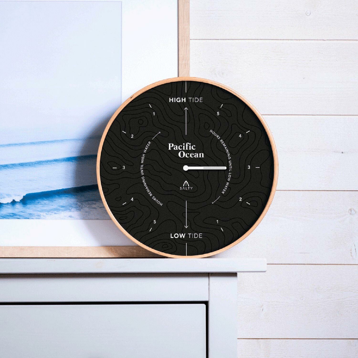 Whether you're a surfer, beach bum, or a landlubber who dreams of days spent by the shore, this SALTY Coastal Themed Tidal Clocks will track the tides to let you know just when they are at their highest and lowest. The Moon is at the origin of tides on Earth. Every lunar day, our planet rotates through two tidal bulges. In coastal areas, two high tides and two low tides happen within 24 hours and 50 minutes. This delay alternating between a high tide and a low tide represents a tide cycle. Stay connected to the ocean from home with your tide clock.