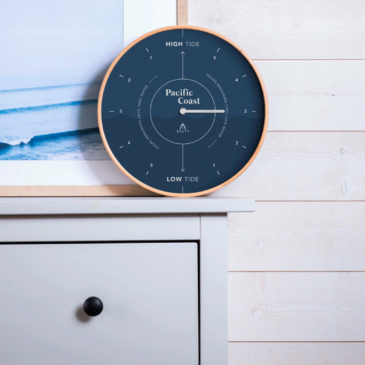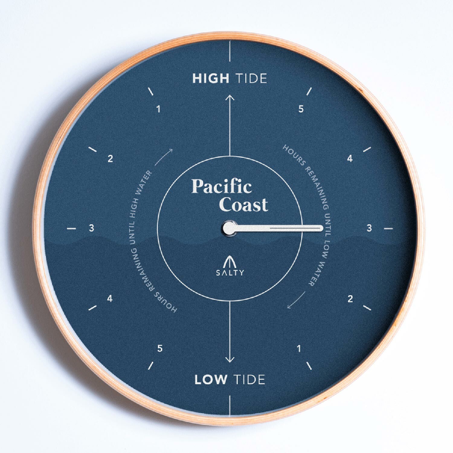 Whether you're a surfer, beach bum, or a landlubber who dreams of days spent by the shore, this SALTY Coastal Themed Tidal Clocks will track the tides to let you know just when they are at their highest and lowest. The Moon is at the origin of tides on Earth. Every lunar day, our planet rotates through two tidal bulges. In coastal areas, two high tides and two low tides happen within 24 hours and 50 minutes. This delay alternating between a high tide and a low tide represents a tide cycle. Stay connected to the ocean from home with your tide clock.