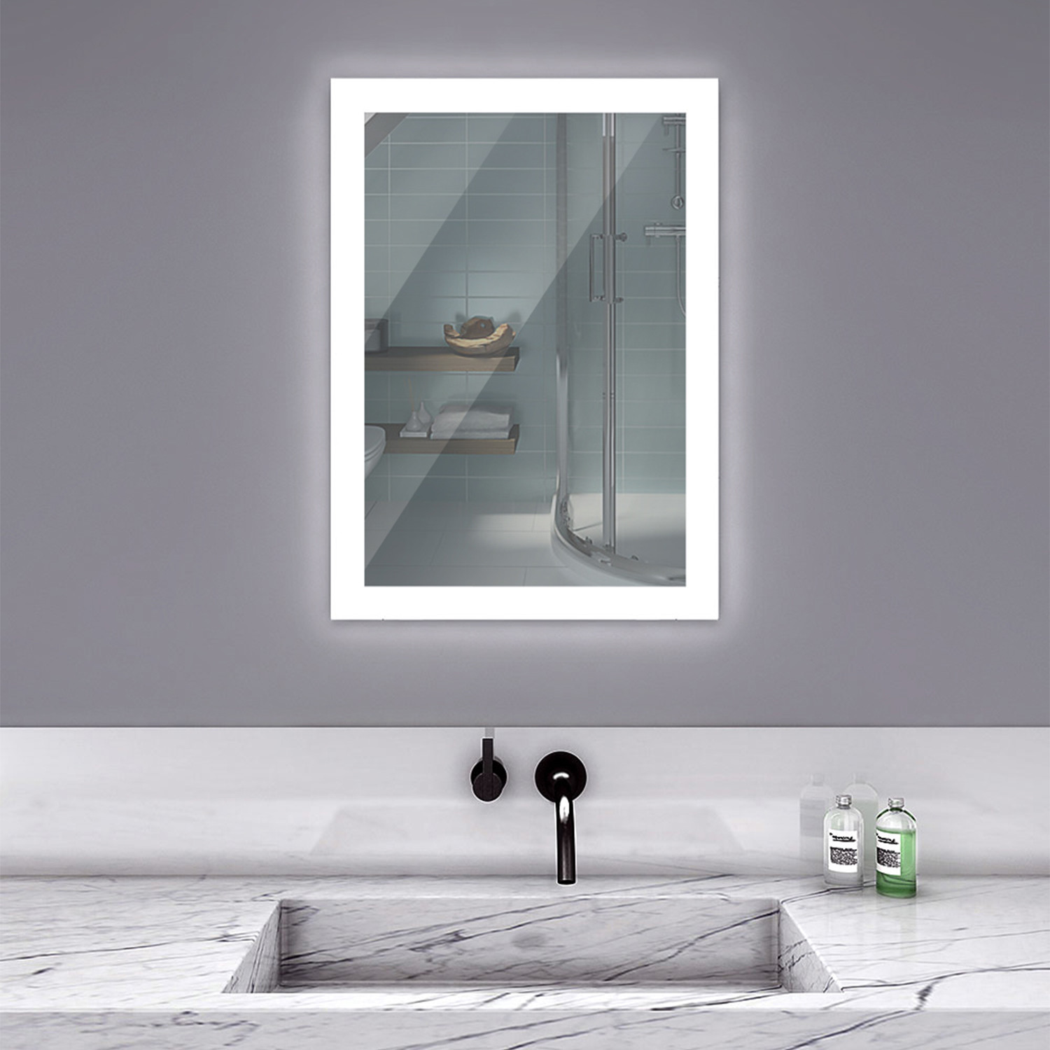 The Angel LED Lighted Mirror features a polished edge mirror that hangs on a white powder coated stainless steel backing. Bright LED backlight shines through the 3” frosted edge of the glass to illuminate the space in all four directions, from all sides. It's the perfect modern way to brighten your bathroom.