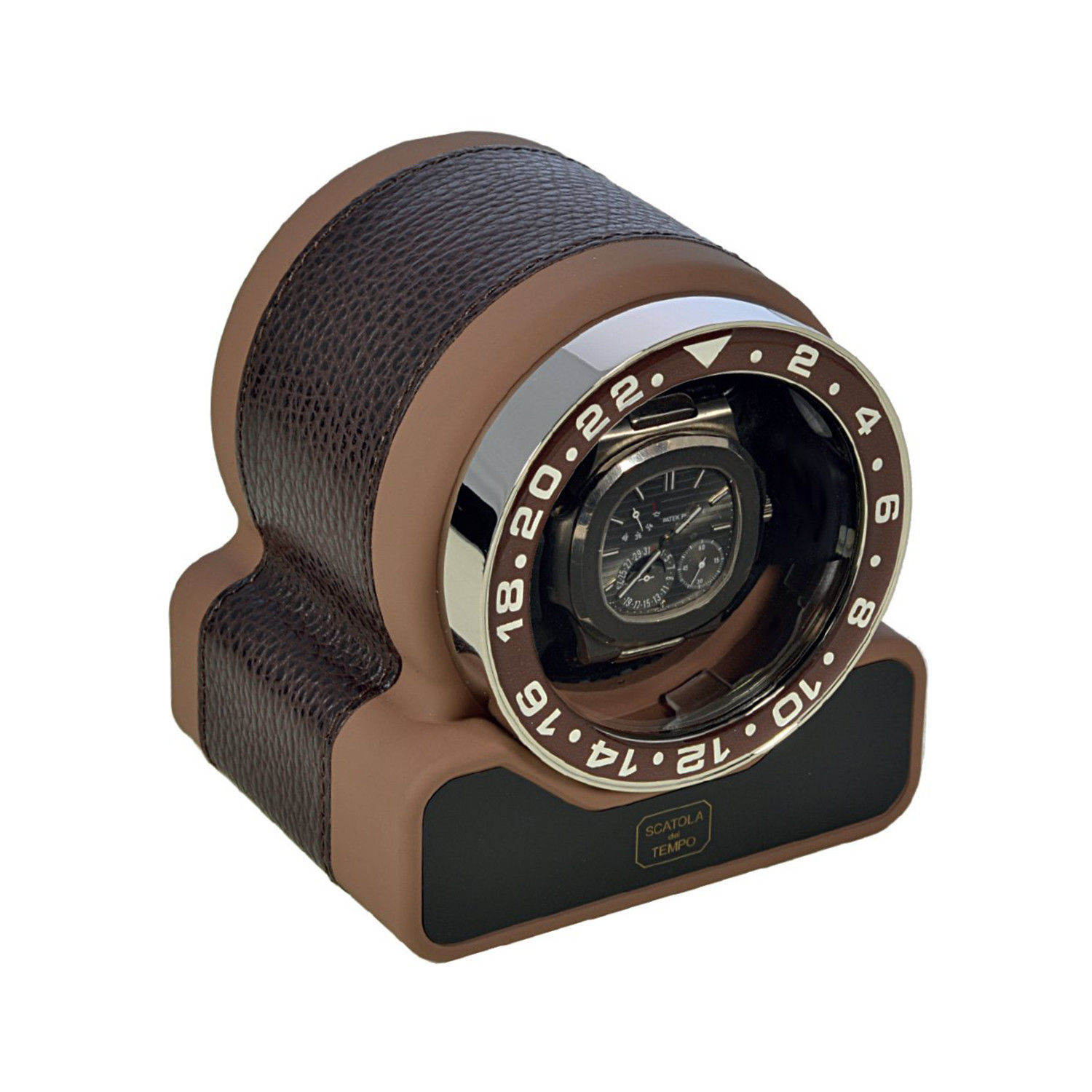 The chassis of the Rotor One Sport is covered with a fine cow leather stripe and a beautiful metal cover lid in silver with a sporting and engaging design. This programmable watch winder operates on batteries (not provided) or with a 3 Volt DC adapter (provided). 2 rotating programs.