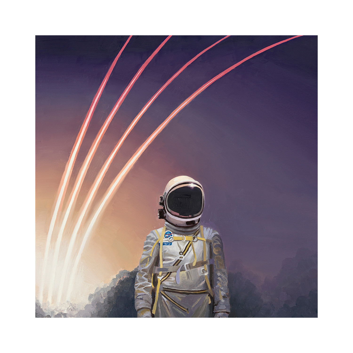 Scott Listfield (b. 1976, Boston, MA) is known for his paintings featuring a lone exploratory astronaut lost in a landscape cluttered with pop culture icons, corporate logos, and tongue-in-cheek science fiction references. This limited edition Giclee work is printed on high quality stretched canvas on a wood frame.