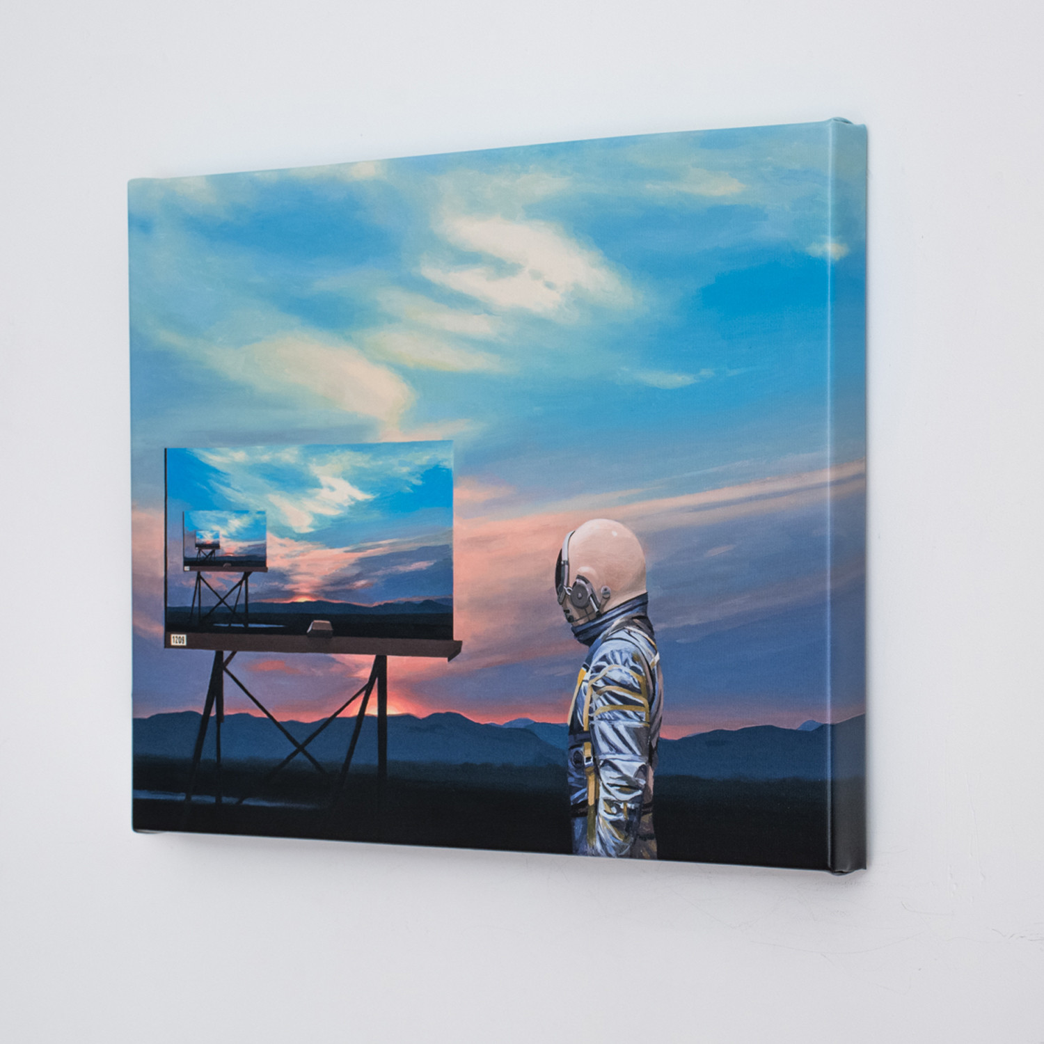 Scott Listfield (b. 1976, Boston, MA) is known for his paintings featuring a lone exploratory astronaut lost in a landscape cluttered with pop culture icons, corporate logos, and tongue-in-cheek science fiction references. This limited edition Giclee work is printed on high quality stretched canvas on a wood frame.