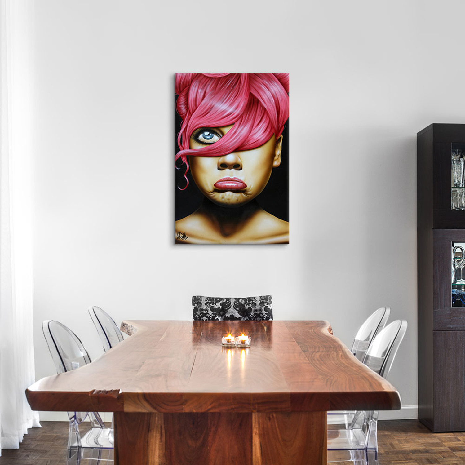 Inspired by motifs from street art, graphic novels, and simply the feminine form, this canvas print from Scott Rohlfs is reminiscent of comic books and retro art style, crafted in tandem with high fashion. Boasting vivid colors and recognizable images, hanging one in your home will invoke nostalgia, beauty and an edgy aesthetic that everyone will talk about.