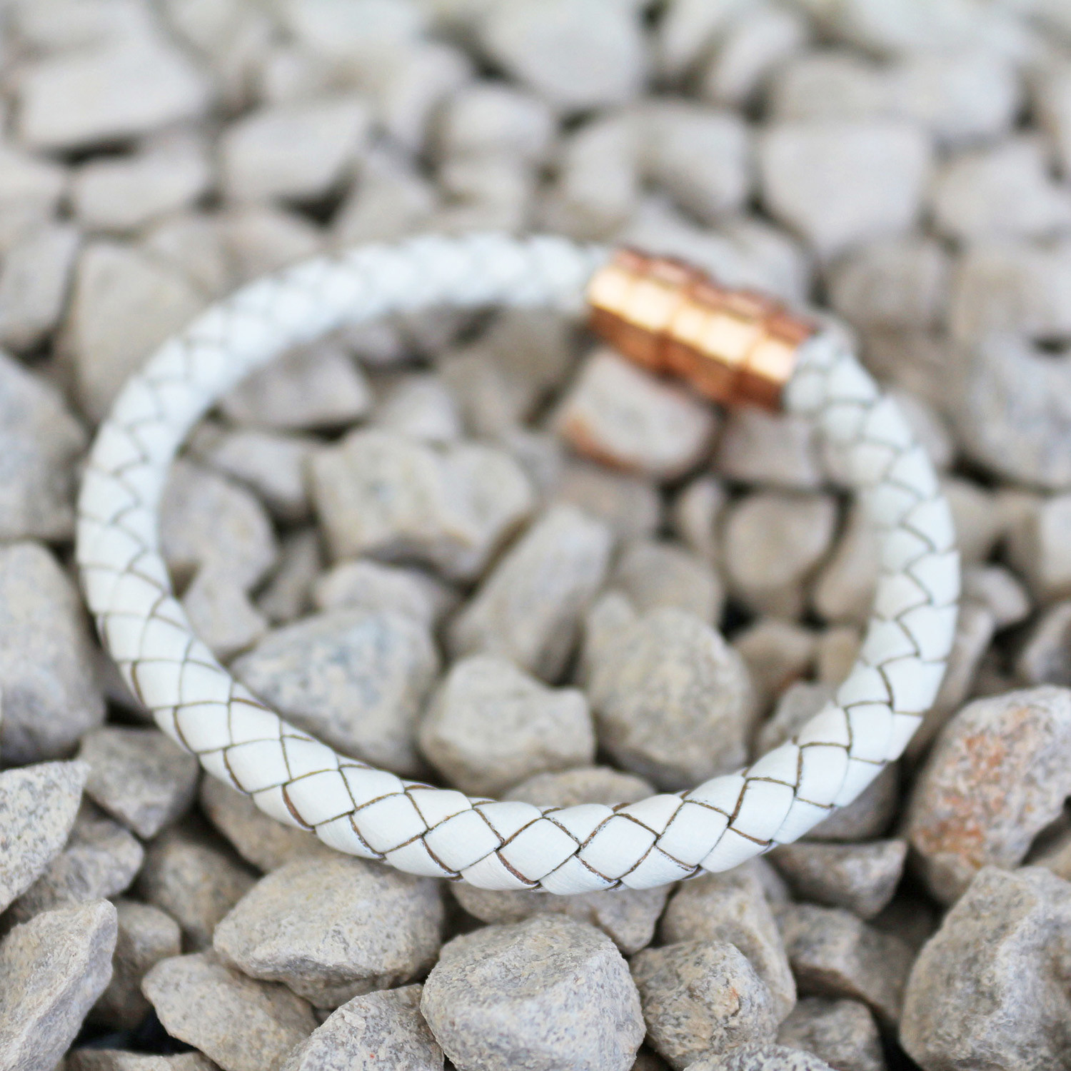 Constructed from 6mm Greek leather, this woven LB Twist bracelet is a timeless piece of wrist-wear that every gentleman should have in his arsenal of accessories. It is finished off with a conspicuous rose gold magnetic clasp made from polished stainless steel.