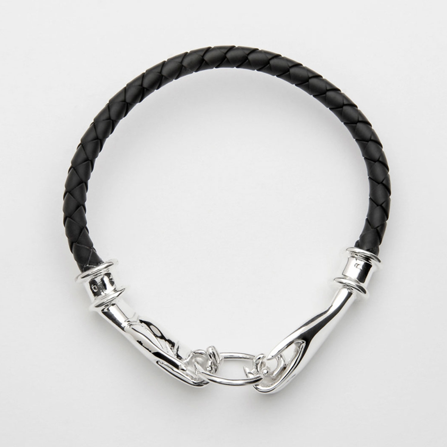 Crafted entirely by hand, this silver and leather piece is comprised of hands joined together to create the clasp, representing the unbreakable bond between lovers.