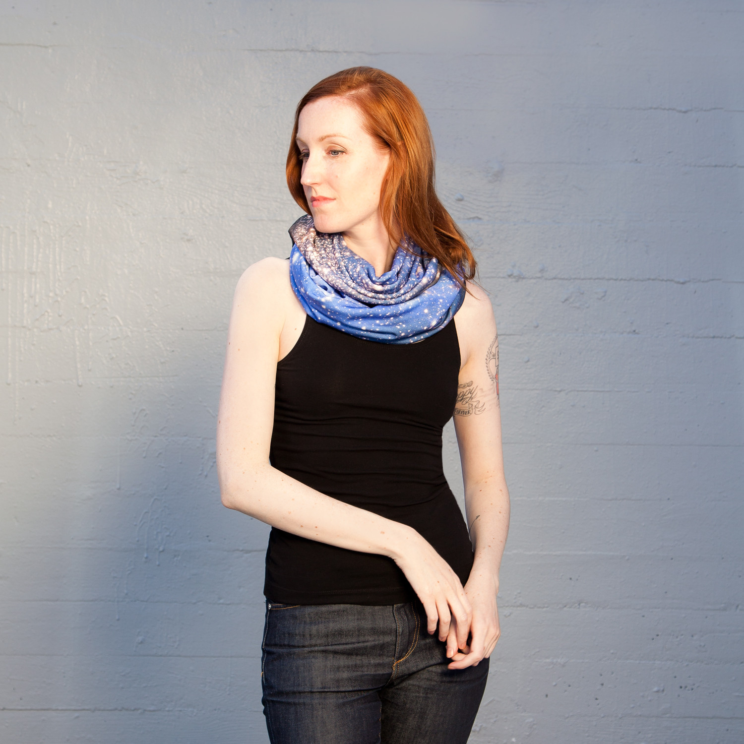 Explore the science of style with this stellar accessory. ShadowPlayNYC's circle scarves are printed on super soft cotton jersey with actual photos of space taken by the Hubble Telescope.
