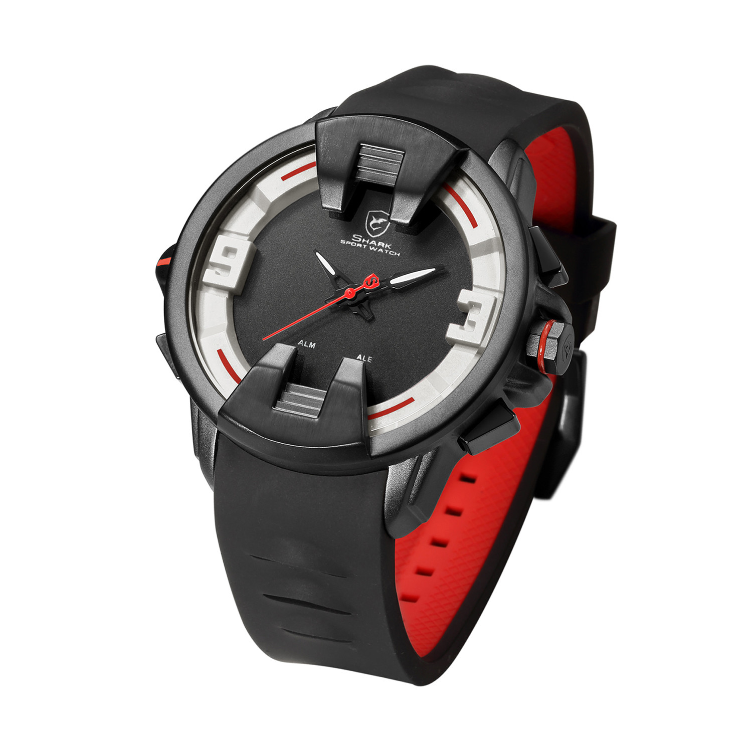 The Wobbegong Shark Quartz is a watch that can take a beating and still bite back. With a tough heavy metal case, this LED watch allows for multiple functions, including day, date, and alarm. The custom designed silicone Shark band adds to both the durability and style of this striking piece.