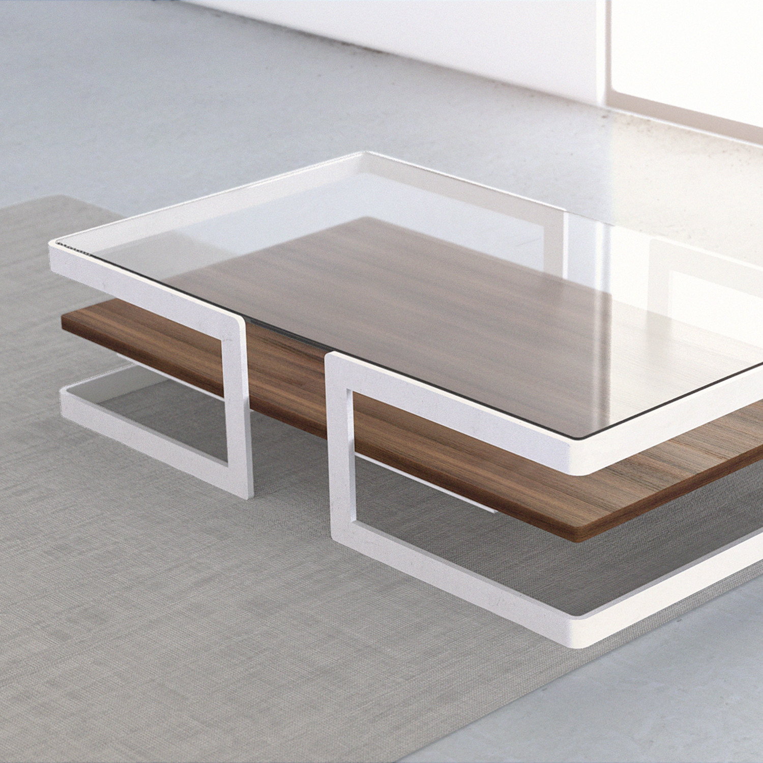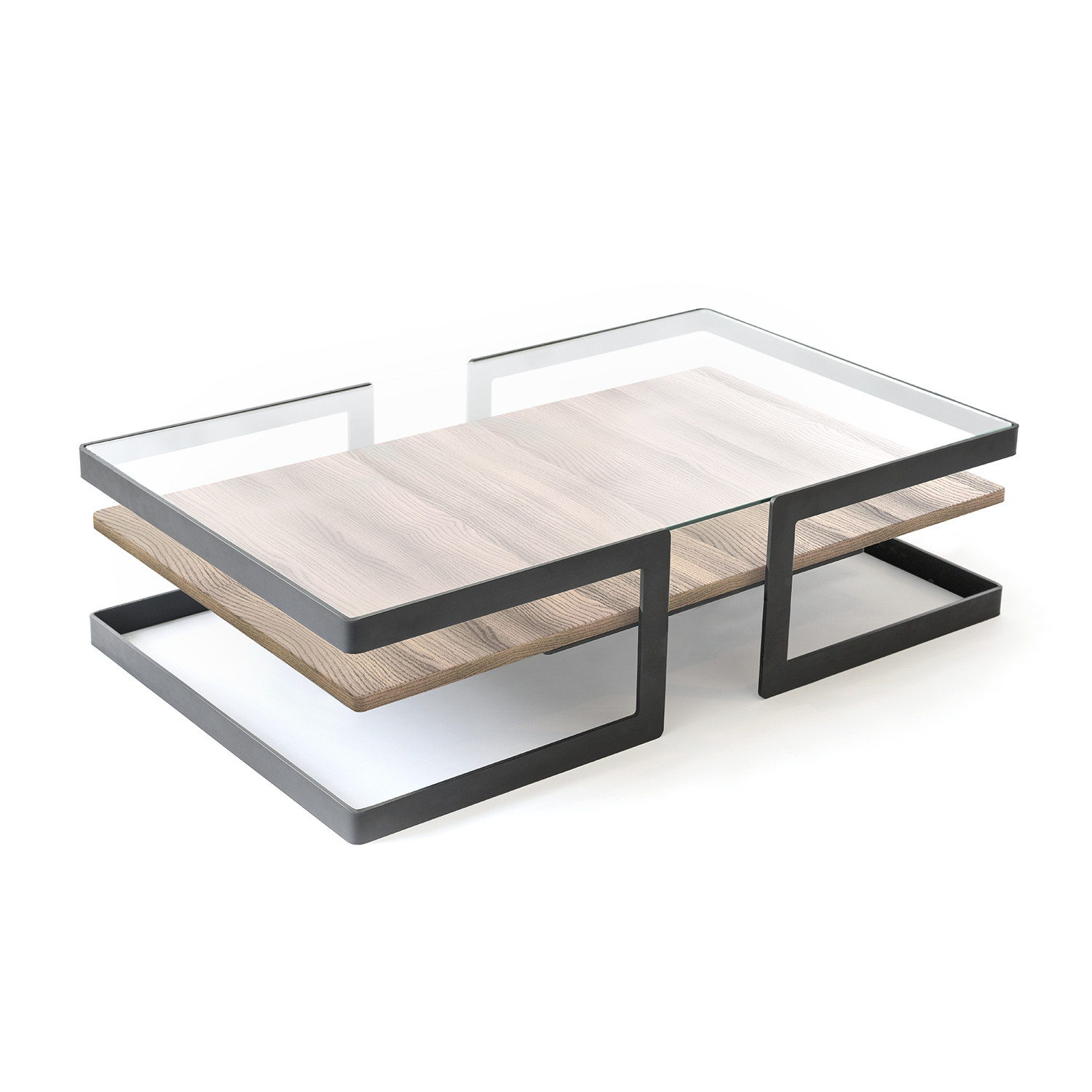 The Lith Center Table coffee table combines matte powder-coated steel, custom cut glass, and rich wood. A highly modern piece you'll love displaying in your home, it's the perfect focal point for your living room.