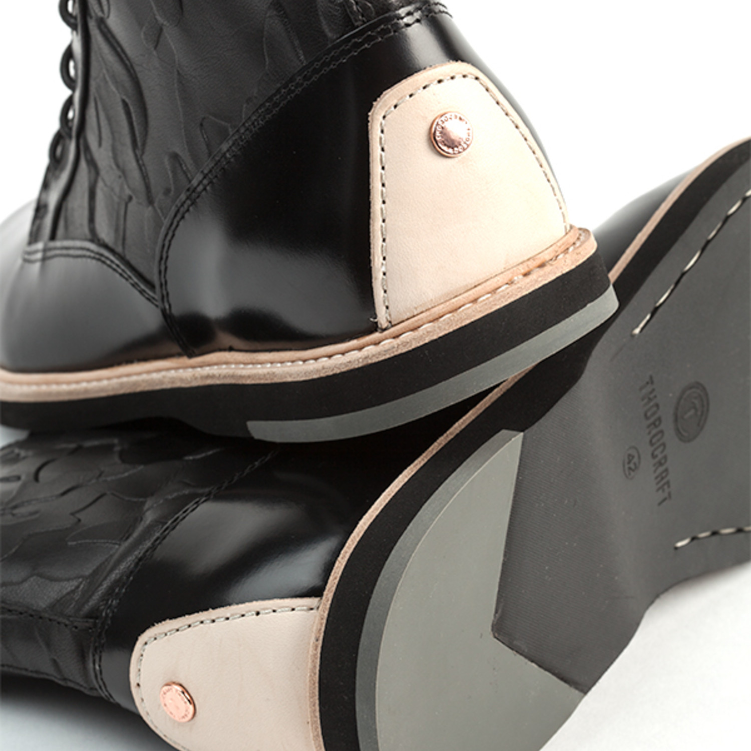 This utilitarian-inspired Hutchinson officer boot is a high polished box leather, paired with an embossed Stetson leather collar. A buttery smooth pigskin leather and cotton blend textile lines the inside of the boot, while THOROCRAFT's signature raw, un-dyed Vachetta leather heel cap will only improve with age and wear.