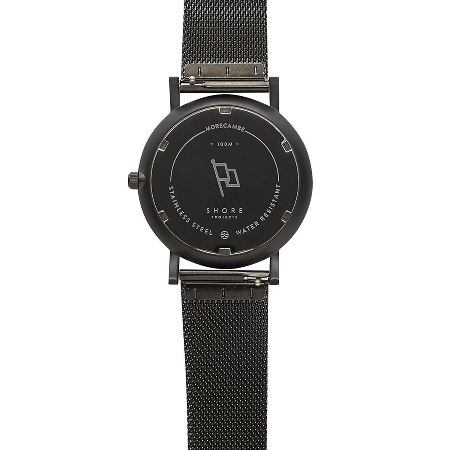 Morecambe is made with a stainless steel cases and crystal sapphire glass. The mesh strap is waterproofed to 100m, which means it is designed for swimming in the sea.