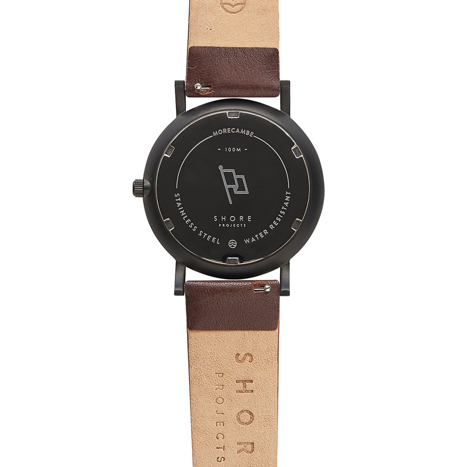 Morecambe is made with a stainless steel cases and crystal sapphire glass. The leather on the strap is of the finest quality, sourced from Italy and waterproofed to 100m, which means it is designed for swimming in the sea.