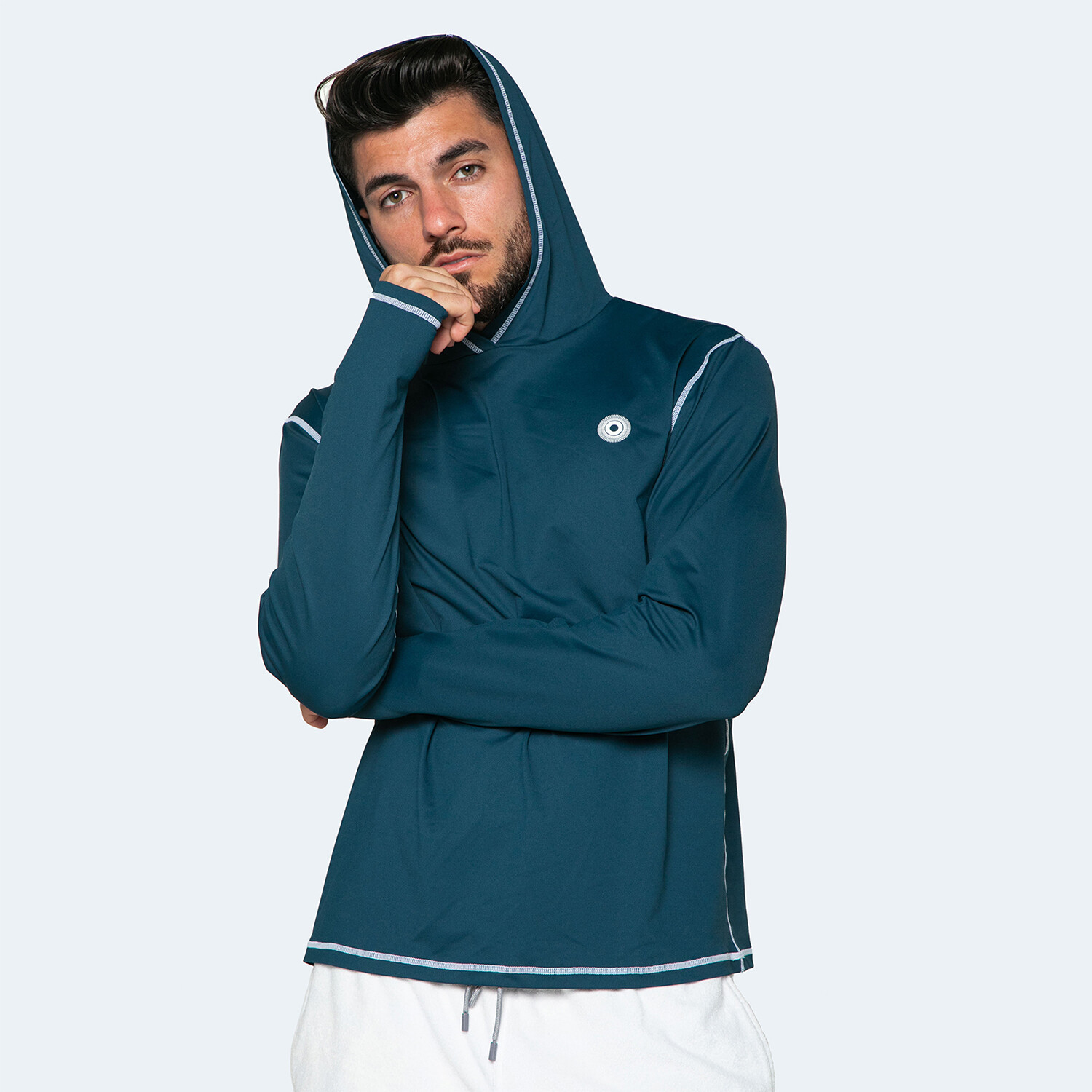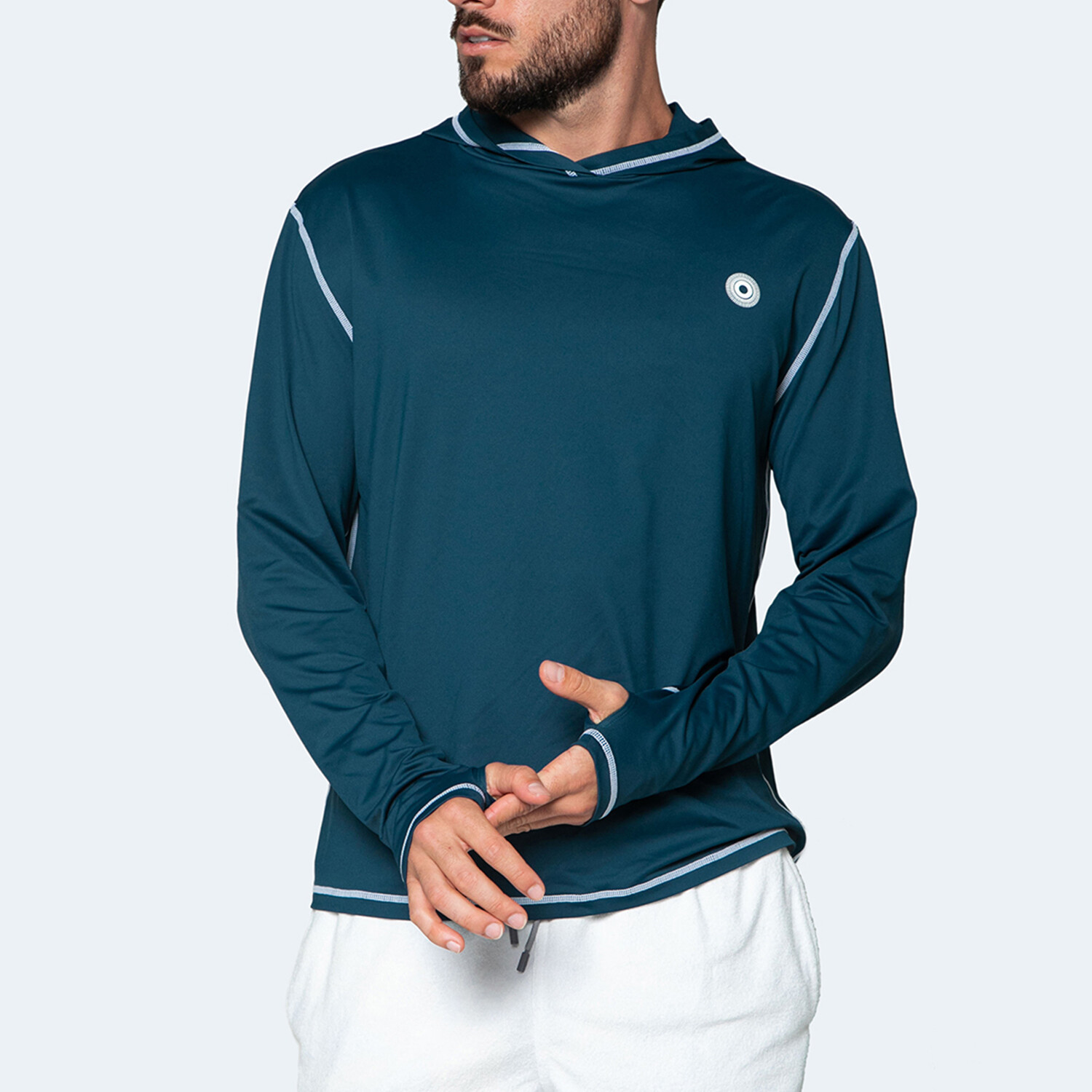 — Nylon & Spandex Hoodie Style Swim Shirt With Contrast Stitching