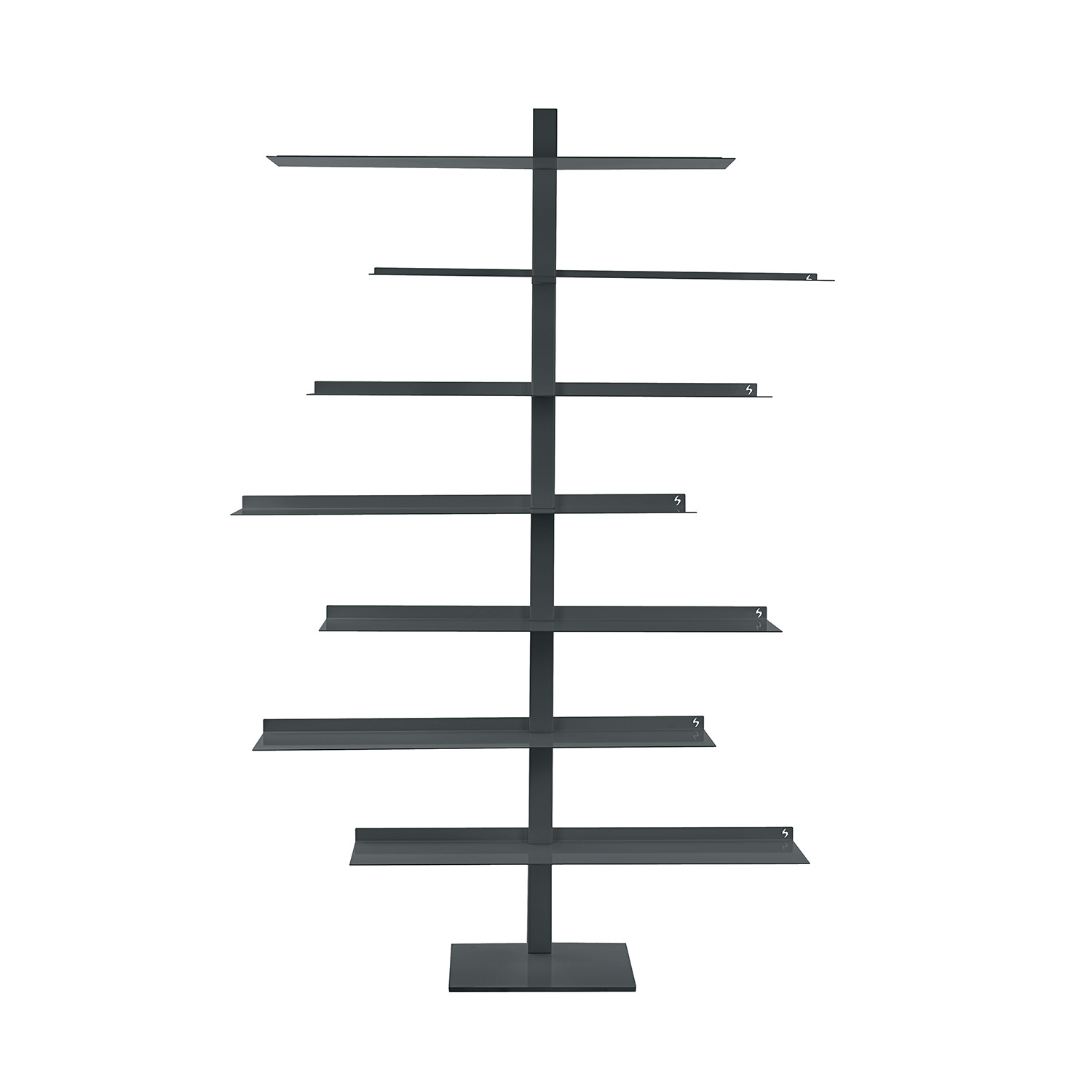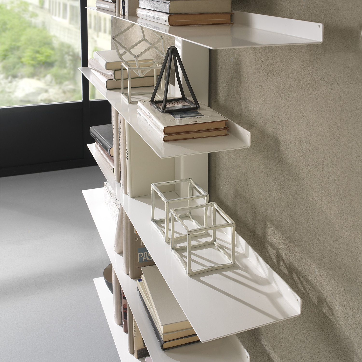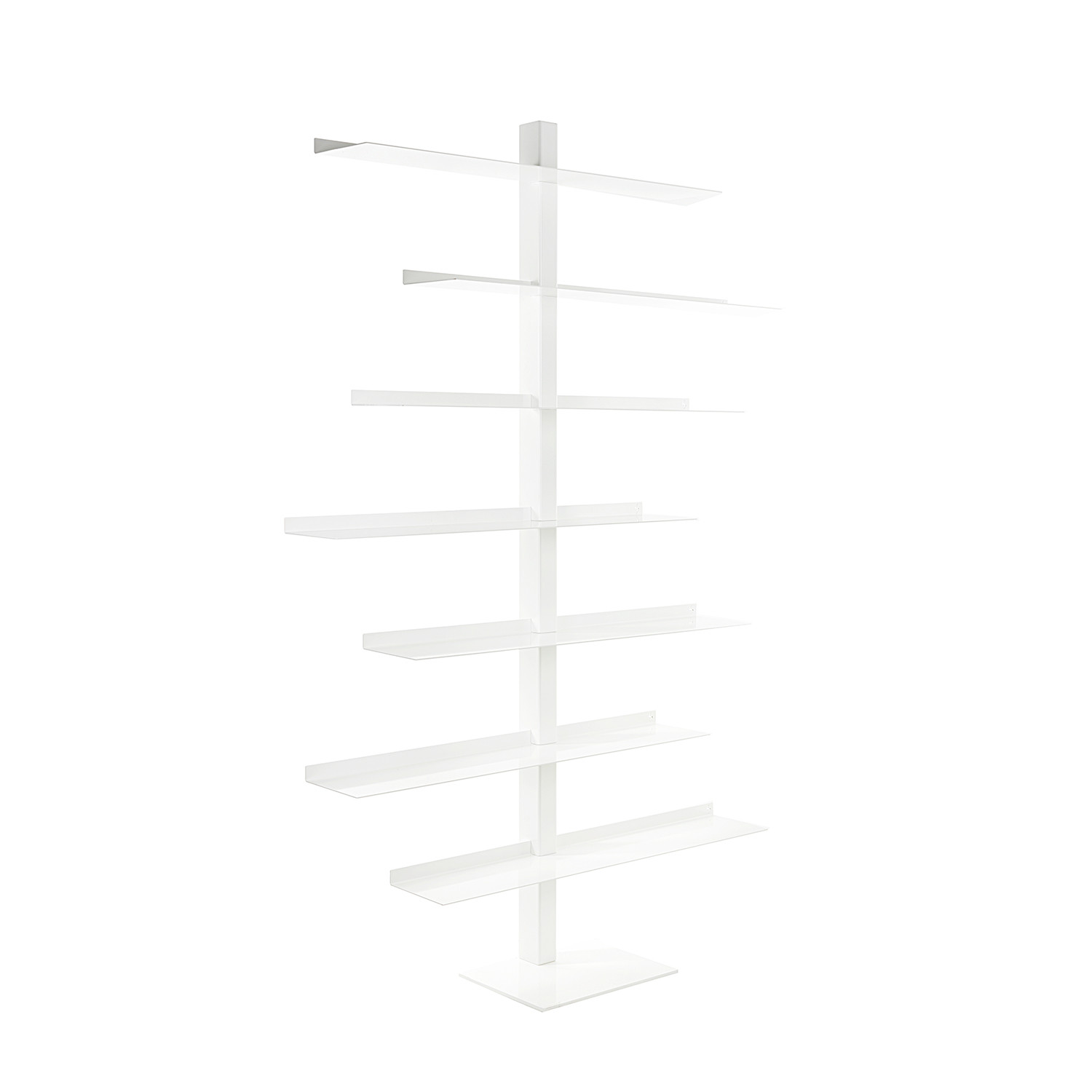 Crafted of 2.5mm thick painted steel sheet, each Apollo has 7 one-meter shelves, and can be left standing, or mounted on a wall.