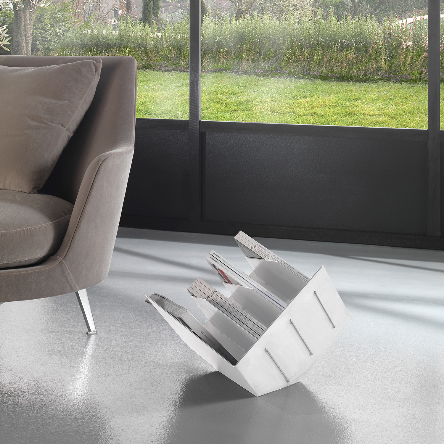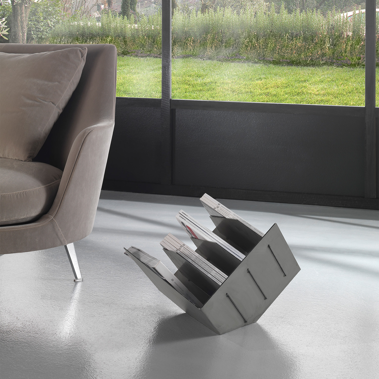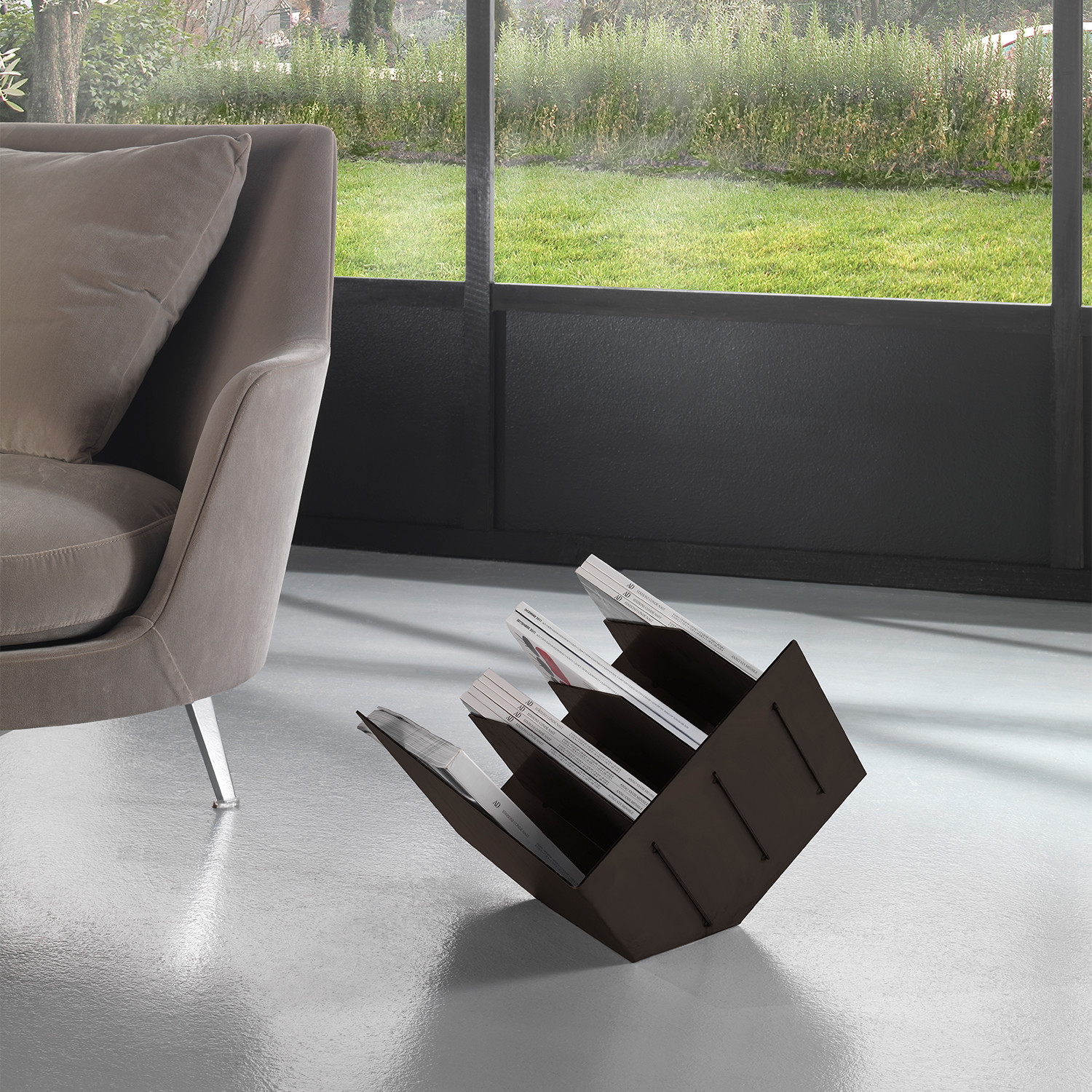 Motio is a steel, designer magazine rack by Siderio, boasting four magazine compartments, placed in a cube-like shape, and tilted sideways thanks to a cut-off corner, looking like it's unstable and on precarious balance - while being perfectly still and steady in place.